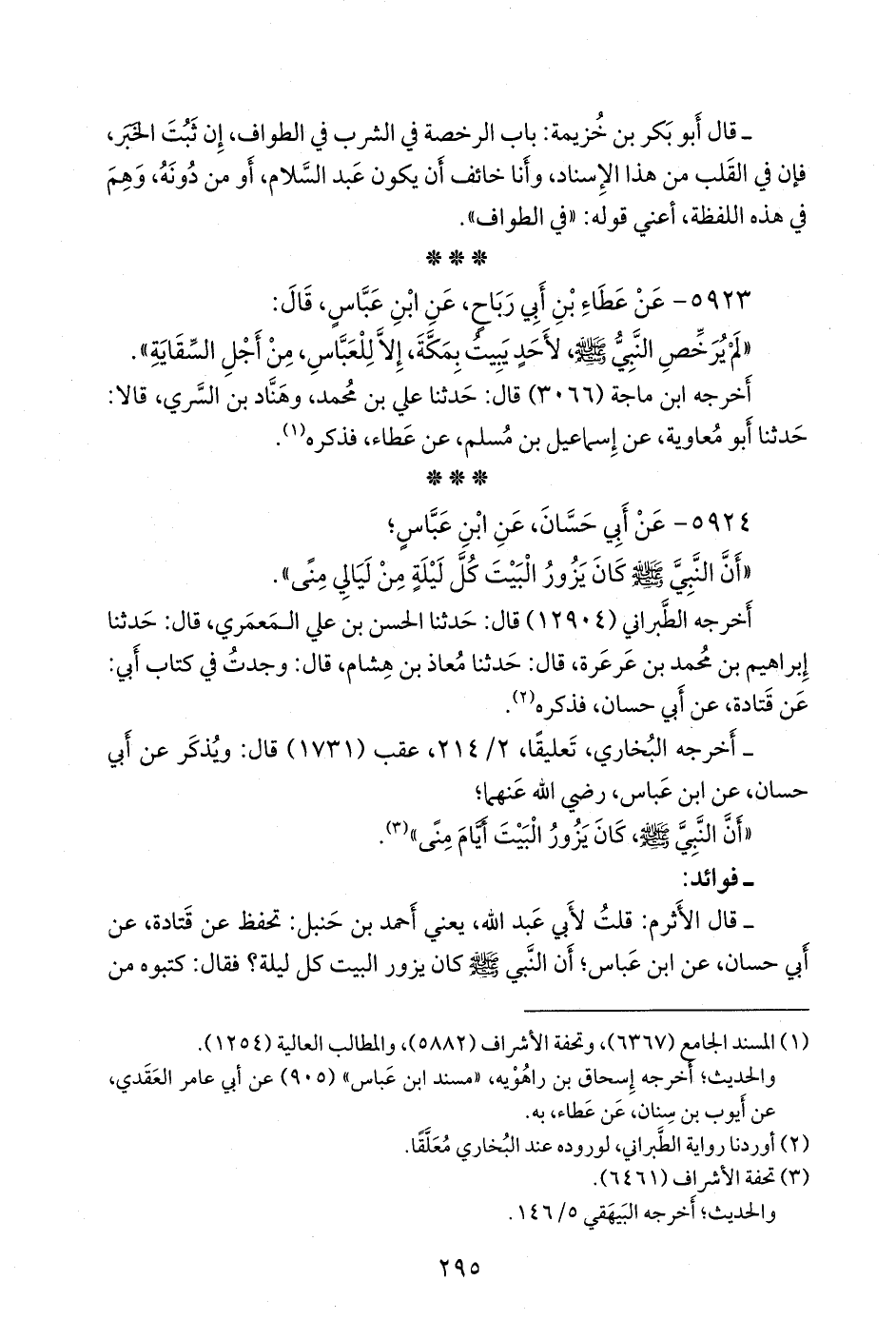 - قال الأثرم: قلت لأبي عبد الله، يعني أحمد بن حنبل: تحفظ عن قتادة، عن أبي حسان، عن ابن عباس؛ أن النبي صَلى الله عَليه وسَلم كان يزور البيت كل ليلة؟ فقال: كتبوه من