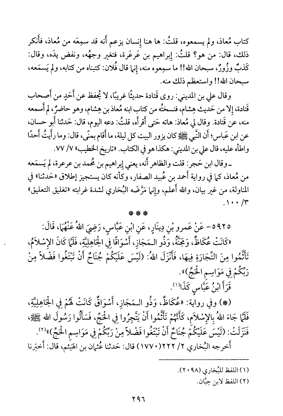 - وفي رواية: «عن ابن عباس، قال: عكاظ، وذو المجاز، أسواق كانت لهم في الجاهلية، فلما جاء الله بالإسلام، كأنهم تأثموا أن يتجروا في الحج، فسألوا رسول الله صَلى الله عَليه وسَلم فنزلت: (ليس عليكم جناح أن تبتغوا فضلا من ربكم في مواسم الحج)» (¬٢).