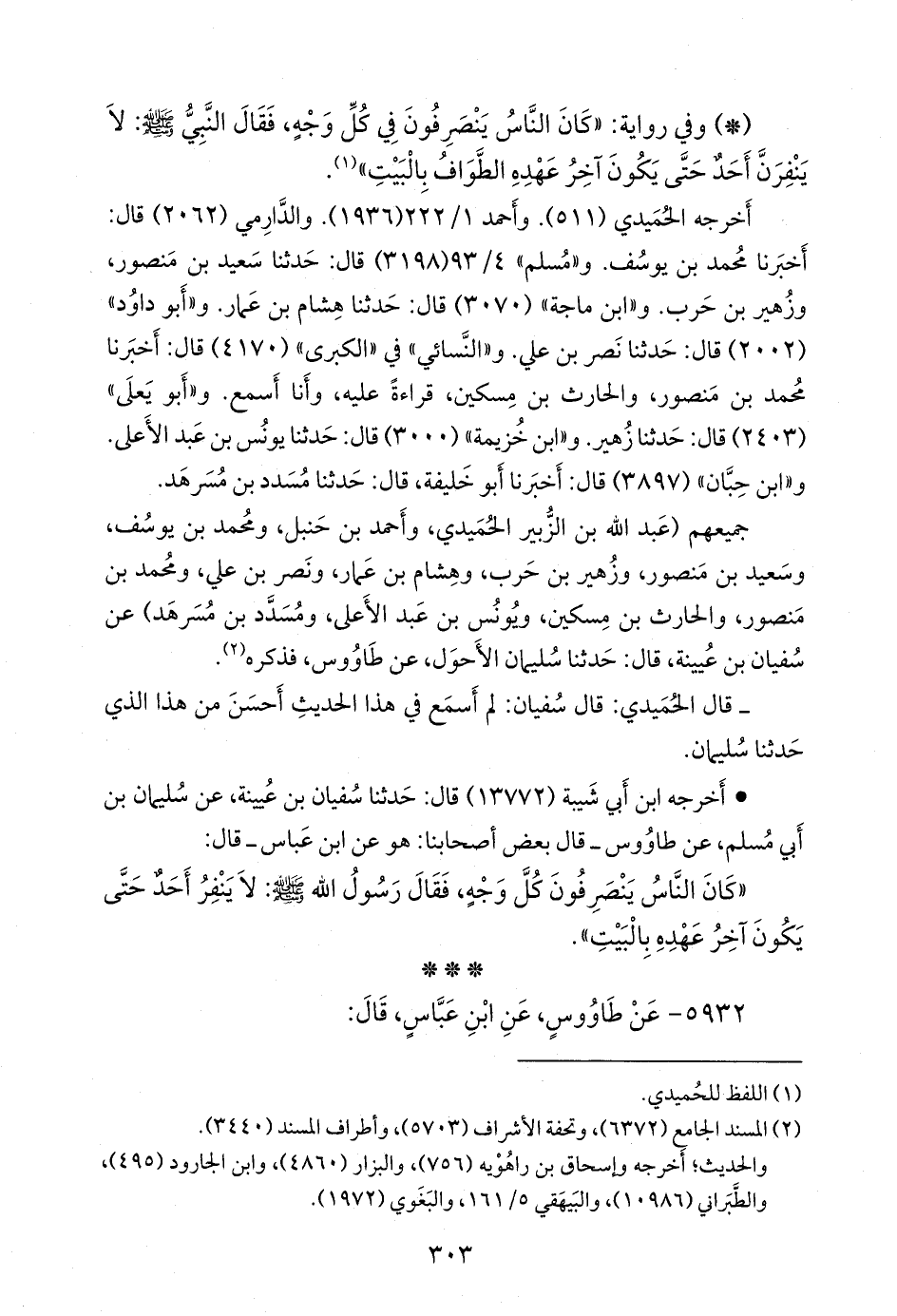 جميعهم (عبد الله بن الزبير الحميدي، وأحمد بن حنبل، ومحمد بن يوسف، وسعيد بن منصور، وزهير بن حرب، وهشام بن عمار، ونصر بن علي، ومحمد بن منصور، والحارث بن مسكين، ويونس بن عبد الأعلى، ومُسَدَّد بن مسرهد) عن سفيان بن عُيينة، قال: حدثنا سليمان الأحول، عن طاووس، فذكره (¬١).