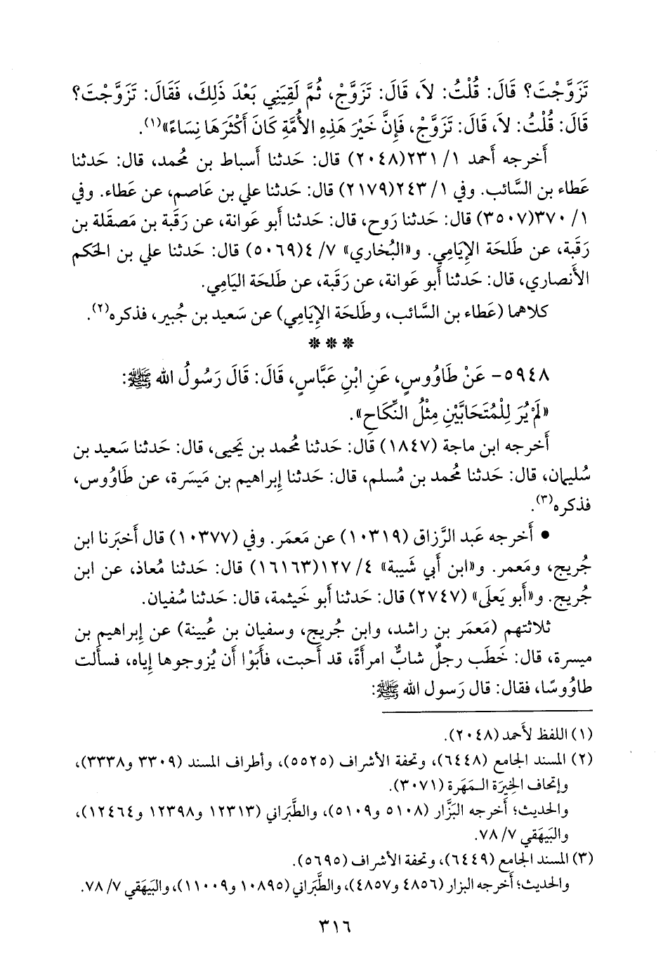 - وفي رواية: «عن طاووس، يبلغ به النبي صَلى الله عَليه وسَلم قال: لم ير للمتحابين مثل النكاح» (¬٣).