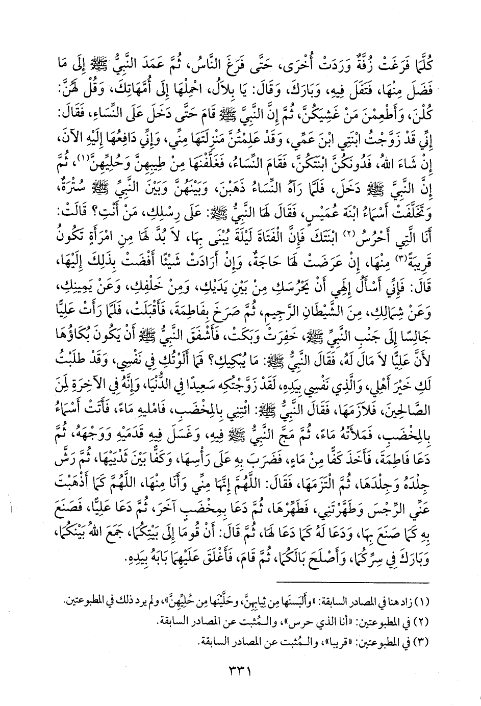 فقام النساءُ، فغلفنها من طيبهن وحليهن، ثم إِن النبي صَلى الله عَليه وسَلم دخل، فلما رآه النساءُ ذهبن، وبينهن وبين النبي صَلى الله عَليه وسَلم سترة، وتخلفت أَسماءُ ابنة عميس، فقال لها النبي صَلى الله عَليه وسَلم: كما أَنت، على رسلك، من أَنت؟ قالت: أَنا التي أَحرس ابنتك، فإِن الفتاة ليلة يبنى بها لا بد لها من امرأَة تكون قريبا منها إِن عرضت لها حاجة، وإِن أَرادت شيئًا أَفضت بذلك إِليها، قال: فإِني أَسأَل إِلهي أَن يحرسك من بين يديك، ومن خلفك، وعن يمينك، وعن شمالك، من الشيطان الرجيم، ثم صرخ بفاطمة، فأَقبلت، فلما رأَت عليا جالسا إِلى جنب النبي صَلى الله عَليه وسَلم خفرت وبكت، فأَشفق النبي صَلى الله عَليه وسَلم أَن يكون بكاؤُها لأَن عليا لا مال له، فقال النبي صَلى الله عَليه وسَلم: ما يبكيك؟ فما أَلوتك في نفسي، وقد طلبت لك خير أَهلي، والذي نفسي بيده، لقد زوجتكه سعيدا في الدنيا، وإِنه في الآخرة لمن الصالحين، فلازمها، فقال النبي صَلى الله عَليه وسَلم: ائْتني بالمخضب، فامليه ماءً، فأَتت أَسماءُ بالمخضب، فملأَته ماءً، ثم مج النبي صَلى الله عَليه وسَلم فيه، وغسل فيه قدميه ووجهه، ثم دعا فاطمة، فأَخذ كفا من ماءٍ، فضرب به على رأْسها، وكفا بين ثدييها، ثم رش جلده وجلدها، ثم التزمها، فقال: اللهم إِنها مني وأَنا منها، اللهم كما أَذهبت عني الرجس وطهرتني، فطهرها، ثم دعا بمخضب آخر، ثم دعا عليا، فصنع به كما صنع بها، ودعا له كما دعا لها، ثم قال: أَن قوما إِلى بيتكما، جمع الله بينكما، وبارك في سركما، وأَصلح بالكما، ثم قام، فأَغلق عليهما بابه بيده.