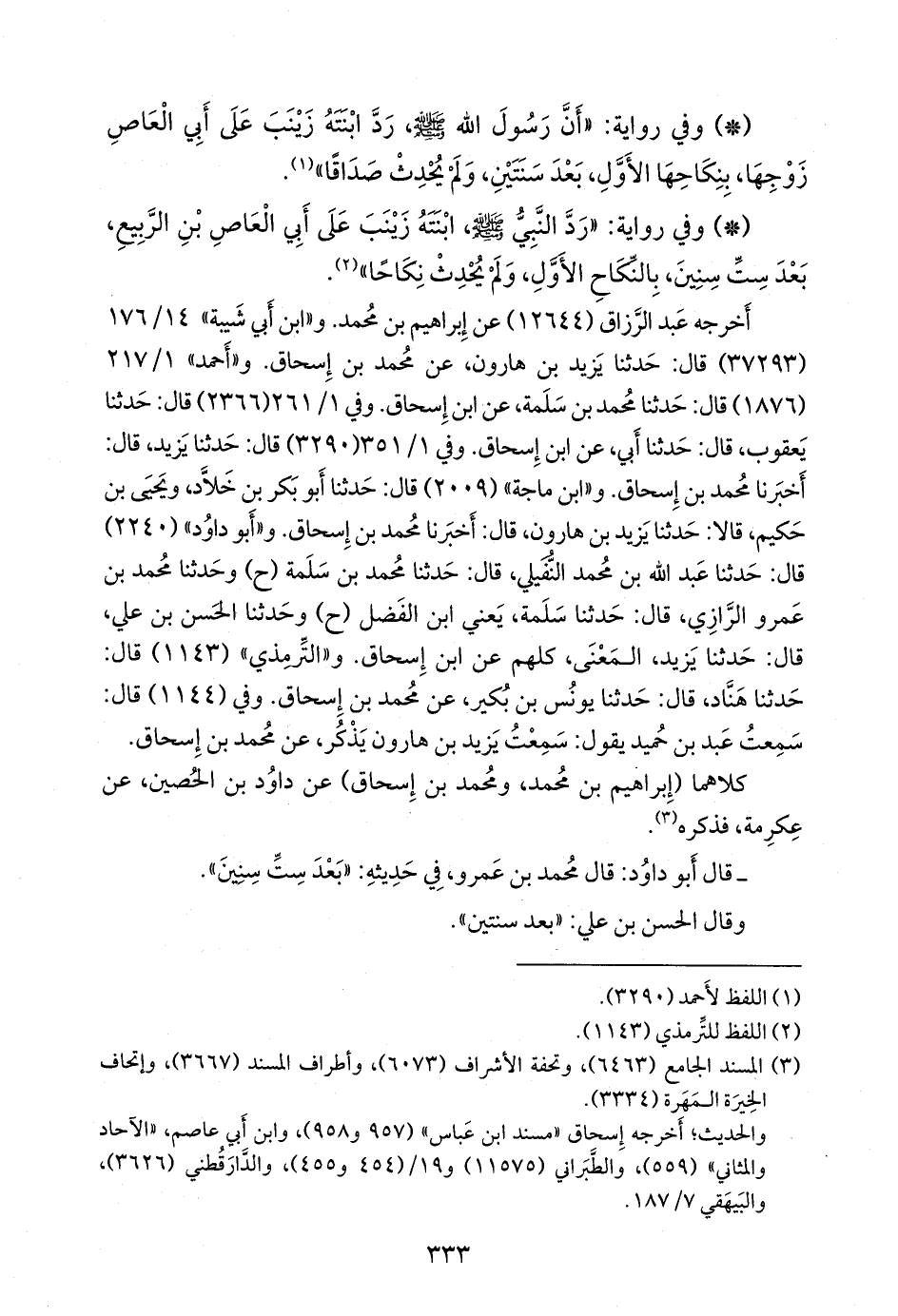 وفي ١/ ٢٦١ (٢٣٦٦) قال: حدثنا يعقوب، قال: حدثنا أبي, عن ابن إسحاق. وفي ١/ ٣٥١ (٣٢٩٠) قال: حدثنا يزيد، قال: أخبرنا محمد بن إسحاق. و «ابن ماجة» (٢٠٠٩) قال: حدثنا أَبو بكر بن خلاد، ويحيى بن حكيم، قالا: حدثنا يزيد بن هارون، قال: أخبرنا محمد بن إسحاق. و «أَبو داود» (٢٢٤٠) قال: حدثنا عبد الله بن محمد النفيلي، قال: حدثنا محمد بن سلمة (ح) وحدثنا محمد بن عَمرو الرازي، قال: حدثنا سلمة، يعني ابن الفضل (ح) وحدثنا الحسن بن علي، قال: حدثنا يزيد، المَعنَى، كلهم عن ابن إسحاق. و «التِّرمِذي» (١١٤٣) قال: حدثنا هَنَّاد، قال: حدثنا يونس بن بكير، عن محمد بن إسحاق. وفي (١١٤٤) قال: سمعت عَبد بن حُميد يقول: سمعت يزيد بن هارون يذكر، عن محمد بن إسحاق.