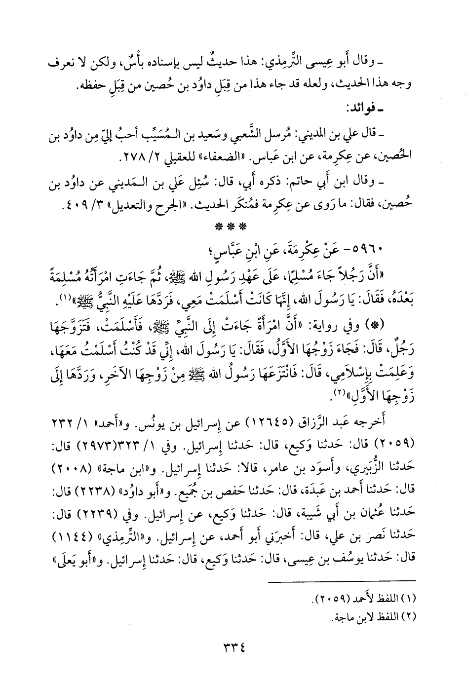 - وفي رواية: «أن امرأة جاءت إلى النبي صَلى الله عَليه وسَلم فأسلمت، فتزوجها رجل، قال: فجاء زوجها الأول، فقال: يا رسول الله، إني قد كنت أسلمت معها، وعلمت بإسلامي، قال: فانتزعها رسول الله صَلى الله عَليه وسَلم من زوجها الآخر، وردها إلى زوجها الأول» (¬٢).