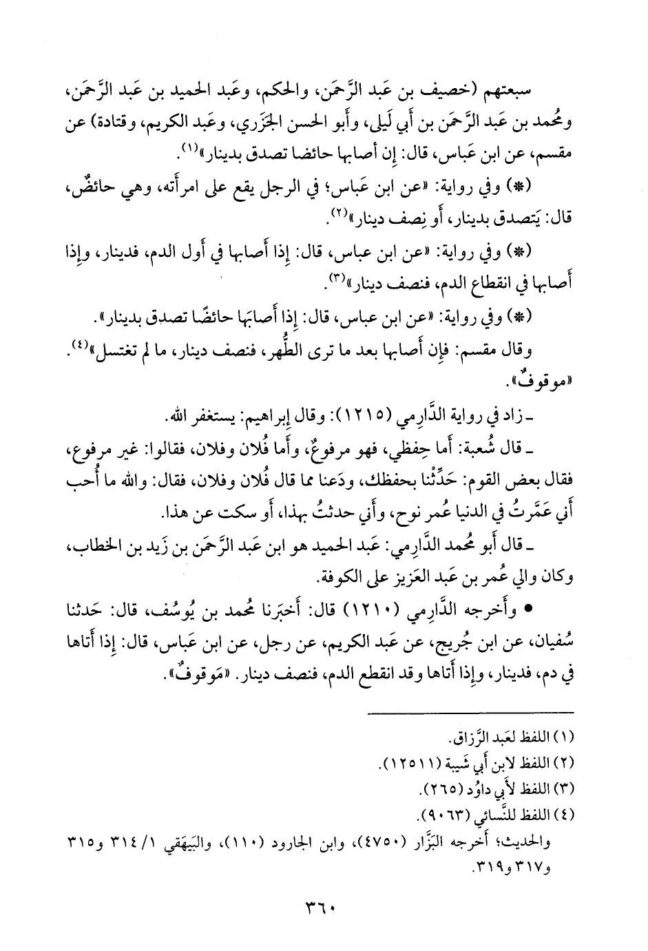 - وفي رواية: «عن ابن عباس؛ في الرجل يقع على امرأته، وهي حائض، قال: يتصدق بدينار، أو نصف دينار» (¬١).