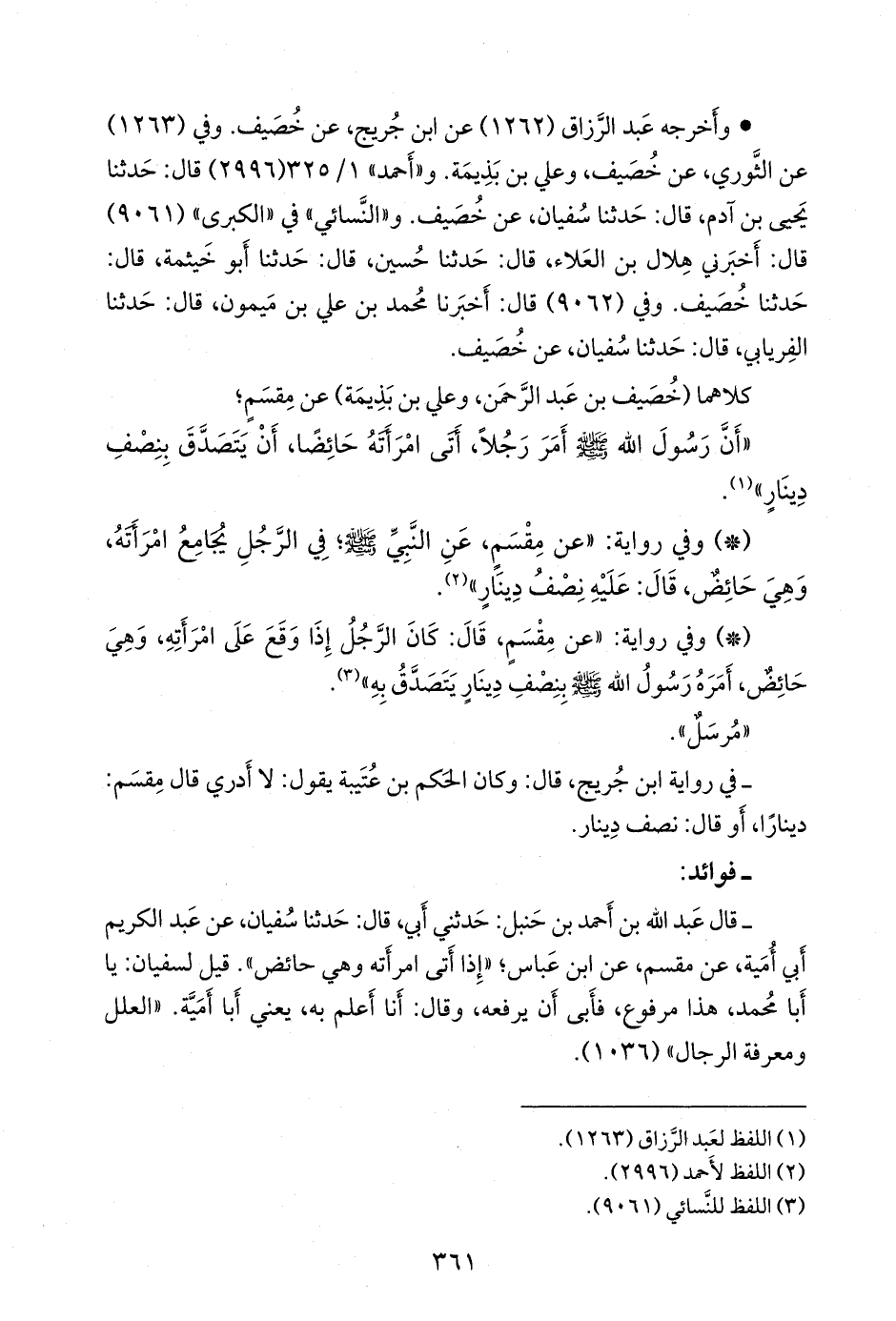 - قلنا: إِسناده ضعيفٌ؛ قال عبد الله بن أحمد بن حنبل: حدثني أبي، قال: حدثنا سفيان، عن عبد الكريم أبي أُمية، عن مِقسَم، عن ابن عباس؛ «إذا أتى امرأته وهي حائض». قيل لسفيان: يا أبا محمد، هذا مرفوع، فأبى أن يرفعه، وقال: أنا أعلم به، يعني أبا أُمية. «العلل ومعرفة الرجال» (١٠٣٦).