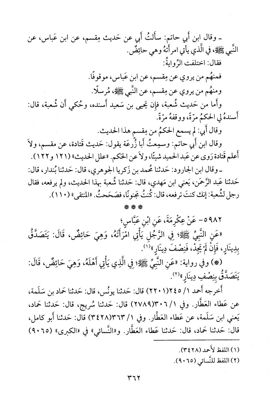 - وفي رواية: «عن النبي صَلى الله عَليه وسَلم؛ في الذي يأتي أهله، وهي حائض، قال: يتصدق بنصف دينار» (¬٢).