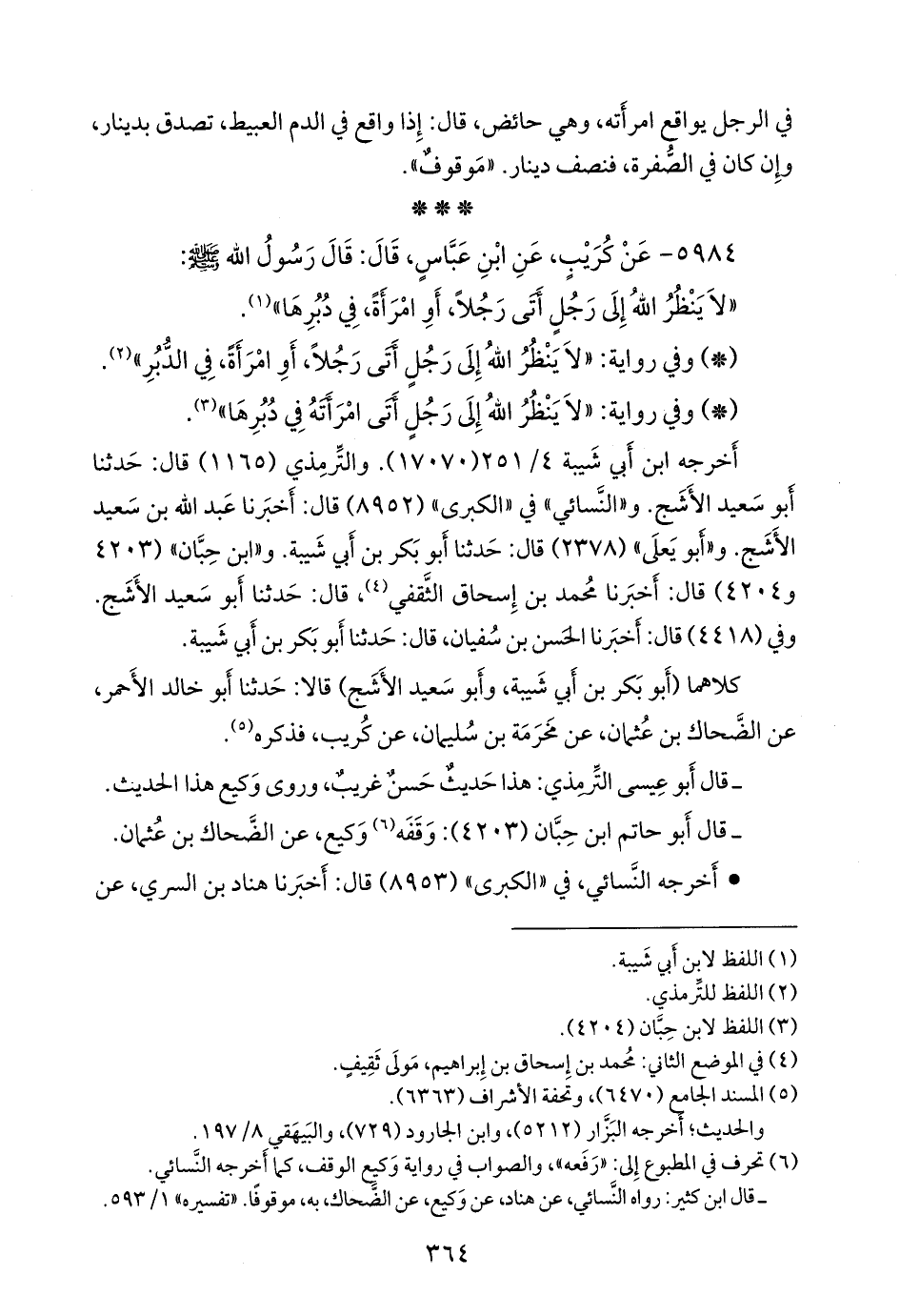 - وفي رواية: «لا ينظر الله إلى رجل أتى رجلا، أو امرأة، في الدبر» (¬٢).