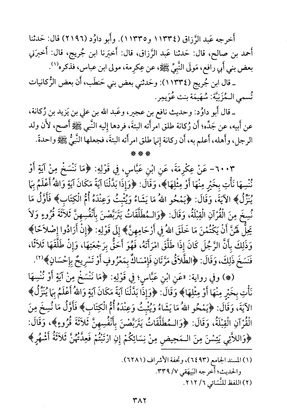 - وفي رواية: «عن ابن عباس؛ في قوله: {ما ننسخ من آية أو ننسها نأت بخير منها أو مثلها} وقال: {وإذا بدلنا آية مكان آية والله أعلم بما ينزل} الآية، وقال: {يمحو الله ما يشاء ويثبت وعنده أم الكتاب} فأول ما نسخ من القرآن القبلة، وقال: {والمطلقات يتربصن بأنفسهن ثلاثة قروء}، وقال: {واللائي يئسن من المحيض من نسائكم إن ارتبتم فعدتهن ثلاثة أشهر}