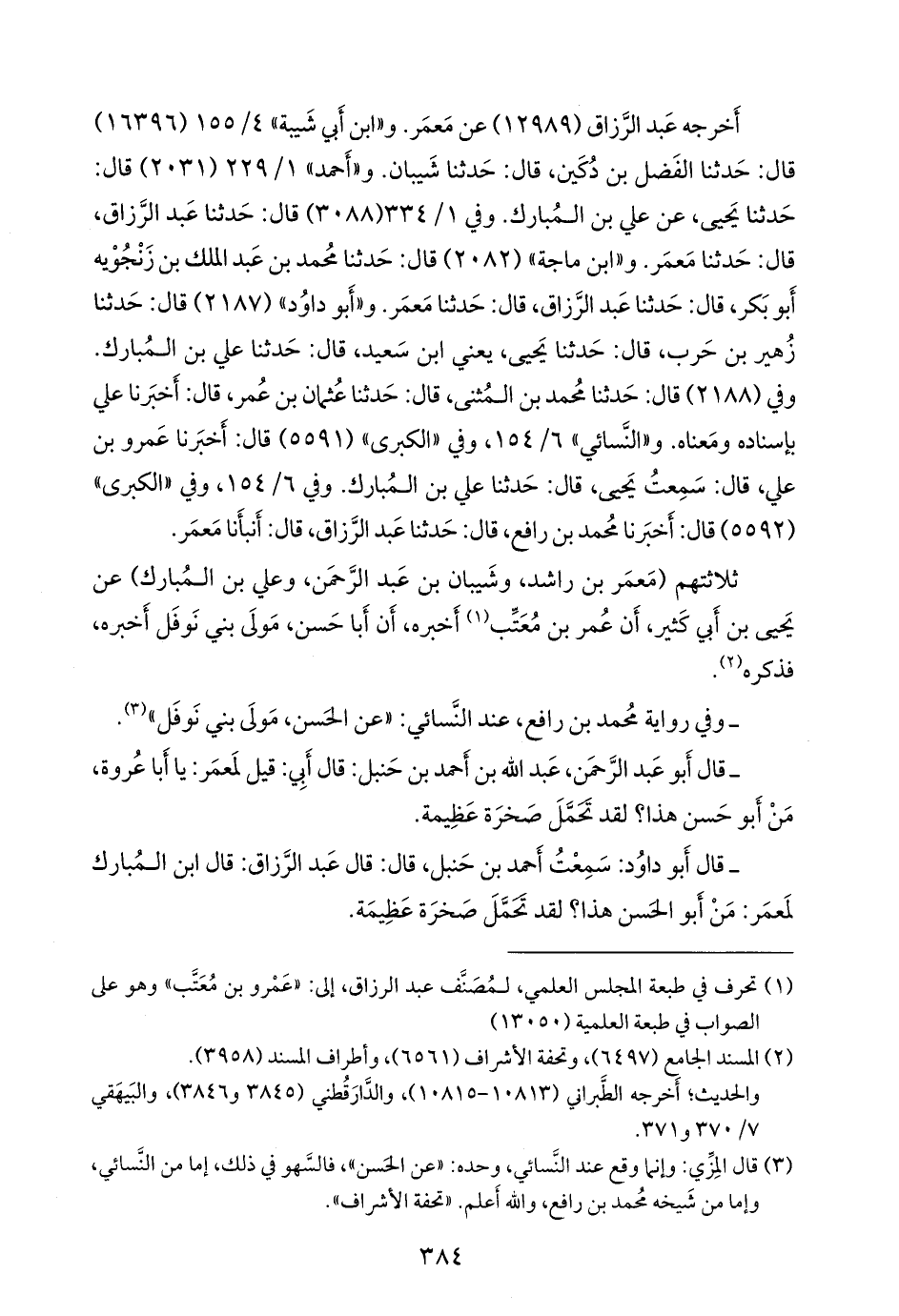 ـ قال أَبو عبد الرَّحمَن عبد الله بن أحمد بن حنبل: قال أبي: قيل لمعمر: يا أبا عروة، من أَبو حسن هذا؟ لقد تحمل صخرة عظيمة.