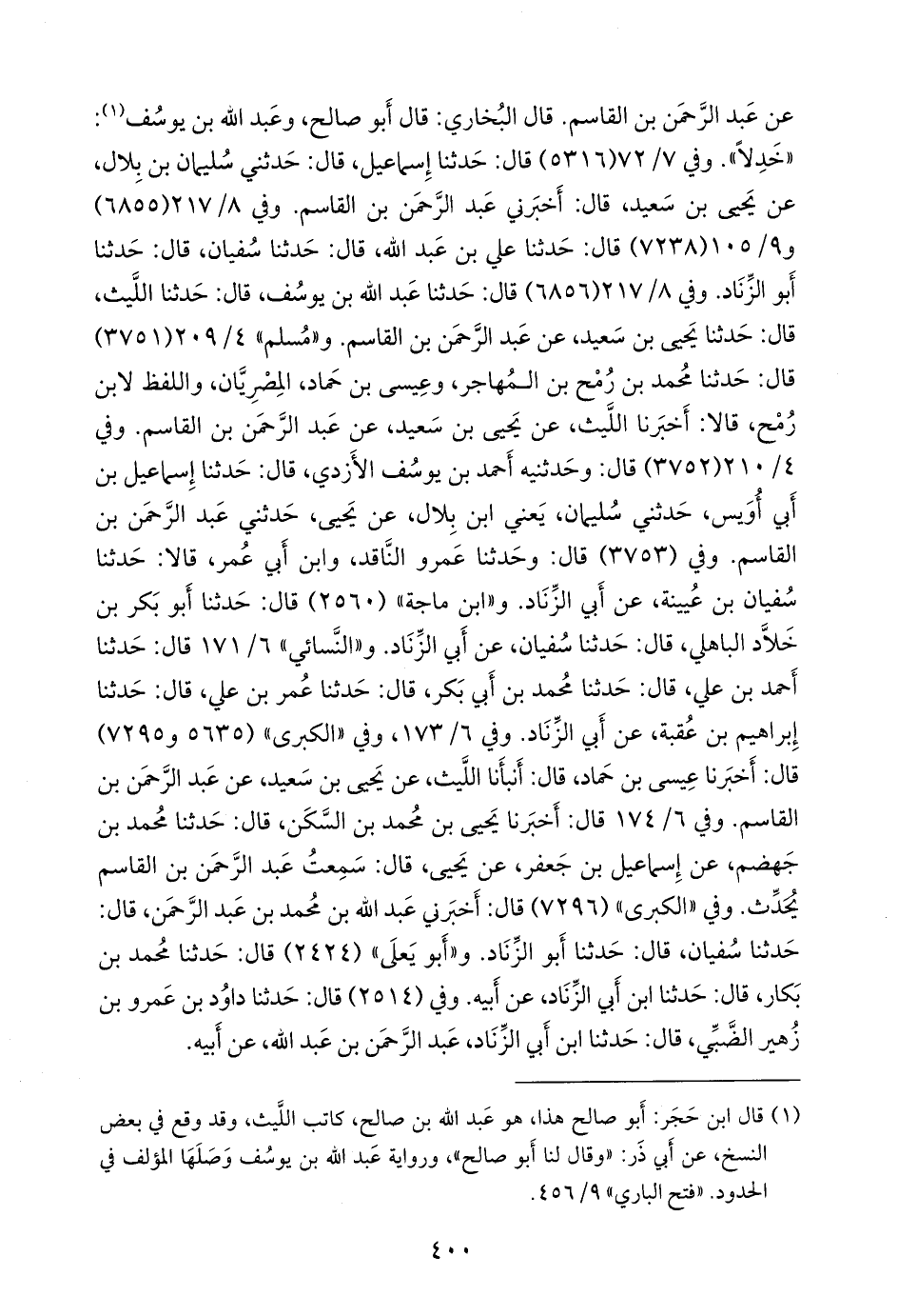 وفي ٧/ ٥٦ (٥٣١٦) قال: حدثنا إسماعيل، قال: حدثني سليمان بن بلال، عن يحيى بن سعيد، قال: أخبرني عبد الرَّحمَن بن القاسم. وفي ٨/ ١٧٥ (٦٨٥٥) و ٩/ ٨٥ (٧٢٣٨) قال: حدثنا علي بن عبد الله، قال: حدثنا سفيان، قال: حدثنا أَبو الزناد. وفي ٨/ ١٧٥ (٦٨٥٦) قال: حدثنا عبد الله بن يوسف، قال: حدثنا الليث، قال: حدثنا يحيى بن سعيد، عن عبد الرَّحمَن بن القاسم. و «مسلم» ٤/ ٢٠٩ (٣٧٥١) قال: حدثنا محمد بن رُمح بن المهاجر، وعيسى بن حماد، المصريان، واللفظ لابن رمح، قالا: أخبرنا الليث، عن يحيى بن سعيد، عن عبد الرَّحمَن بن القاسم. وفي ٤/ ٢١٠ (٣٧٥٢) قال: وحدثنيه أحمد بن يوسف الأزدي، قال: حدثنا إسماعيل بن أبي أويس، قال: حدثني سليمان، يعني ابن بلال، عن يحيى، قال: حدثني عبد الرَّحمَن بن القاسم. وفي (٣٧٥٣) قال: وحدثنا عَمرو الناقد، وابن أبي عمر، قالا: حدثنا سفيان بن عُيينة، عن أبي الزناد. و «ابن ماجة» (٢٥٦٠) قال: حدثنا أَبو بكر بن خلاد الباهلي، قال: حدثنا سفيان، عن أبي الزناد. و «النَّسَائي» ٦/ ١٧١ قال: حدثنا أحمد بن علي، قال: حدثنا محمد بن أَبي بكر، قال: حدثنا عمر بن علي، قال: حدثنا إبراهيم بن عُقبة، عن أبي الزناد. وفي ٦/ ١٧٣، وفي «الكبرى» (٥٦٣٥ و ٧٢٩٥) قال: أخبرنا عيسى بن حماد، قال: أنبأنا الليث، عن يحيى بن سعيد، عن عبد الرَّحمَن بن القاسم. وفي ٦/ ١٧٤ قال: أخبرنا يحيى بن محمد بن السكن، قال: حدثنا محمد بن جهضم، عن إسماعيل بن جعفر, عن يحيى, قال: سمعت عبد الرَّحمَن بن القاسم يحدث. وفي «الكبرى» (٧٢٩٦) قال: أخبرني عبد الله بن محمد بن عبد الرَّحمَن، قال: حدثنا سفيان، قال: حدثنا أَبو الزناد. و «أَبو يَعلى» (٢٤٢٤) قال: حدثنا محمد بن بكار، قال: حدثنا ابن أبي الزناد، عن أبيه. وفي (٢٥١٤) قال: حدثنا داود بن عَمرو بن زهير الضبي، قال: حدثنا ابن أبي الزناد عبد الرَّحمَن بن عبد الله، عن أبيه.