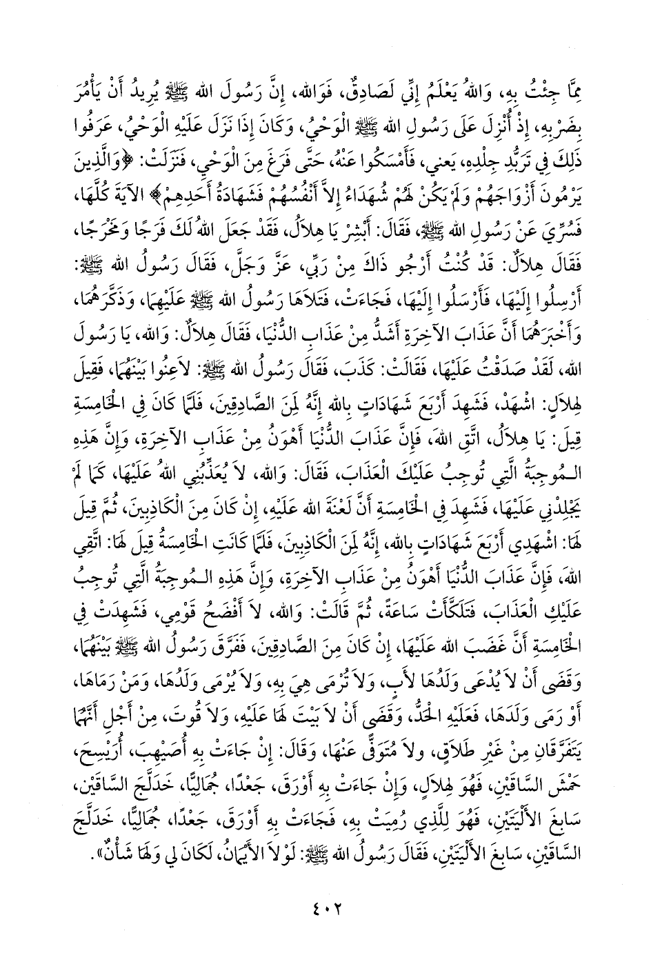 فنزلت: {والذين يرمون أزواجهم ولم يكن لهم شهداء إلا أنفسهم فشهادة أحدهم} الآية كلها، فسري عن رسول الله صَلى الله عَليه وسَلم فقال: أبشر يا هلال، فقد جعل الله لك فرجا ومخرجا، فقال هلال: قد كنت أرجو ذاك من ربي، عز وجل، فقال رسول الله صَلى الله عَليه وسَلم: أرسلوا إليها، فأرسلوا إليها، فجاءت، فتلاها رسول الله صَلى الله عَليه وسَلم عليهما، وذكرهما، وأخبرهما أن عذاب الآخرة أشد من عذاب الدنيا، فقال هلال: والله، يا رسول الله، لقد صدقت عليها، فقالت: كذب، فقال رسول الله صَلى الله عَليه وسَلم: لاعنوا بينهما، فقيل لهلال: اشهد، فشهد أربع شهادات بالله إنه لمن الصادقين، فلما كان في الخامسة قيل: يا هلال، اتق الله، فإن عذاب الدنيا أهون من عذاب الآخرة، وإن هذه الموجبة التي توجب عليك العذاب، فقال: والله، لا يعذبني الله عليها، كما لم يجلدني عليها، فشهد في الخامسة أن لعنة الله عليه، إن كان من الكاذبين، ثم قيل لها: اشهدي أربع شهادات بالله، إنه لمن الكاذبين، فلما كانت الخامسة قيل لها: اتقي الله، فإن عذاب الدنيا أهون من عذاب الآخرة، وإن هذه الموجبة التي توجب عليك العذاب، فتلكأت ساعة، ثم قالت: والله، لا أفضح قومي، فشهدت في الخامسة أن غضب الله عليها، إن كان من الصادقين، ففرق رسول الله صَلى الله عَليه وسَلم بينهما، وقضى أن لا يدعى ولدها لأب، ولا ترمى هي به، ولا يرمى ولدها، ومن رماها، أو رمى ولدها، فعليه الحد، وقضى أن لا بيت لها عليه، ولا قوت، من أجل أنهما يتفرقان من غير طلاق، ولا متوفى عنها، وقال: إن جاءت به أصيهب، أريسح، حمش الساقين، فهو لهلال، وإن جاءت به أورق، جعدا، جماليا، خدلج الساقين، سابغ الأليتين، فهو للذي رميت به، فجاءت به أورق، جعدا، جماليا، خدلج الساقين، سابغ الأليتين، فقال رسول الله صَلى الله عَليه وسَلم: لولا الأيمان، لكان لي ولها شأن».