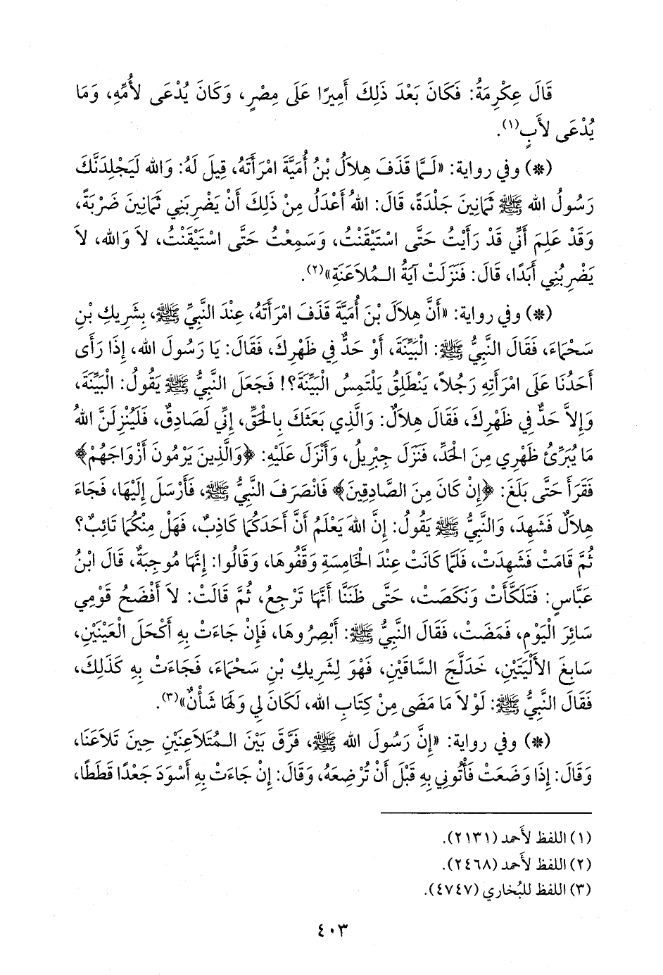- وفي رواية: «أن هلال بن أُمية قذف امرأته، عند النبي صَلى الله عَليه وسَلم بشريك بن سحماء، فقال النبي صَلى الله عَليه وسَلم: البينة، أو حد في ظهرك، فقال: يا رسول الله، إذا رأى أحدنا على امرأته رجلا، ينطلق يلتمس البينة؟! فجعل النبي صَلى الله عَليه وسَلم يقول: البينة، وإلا حد في ظهرك، فقال هلال: والذي بعثك بالحق، إني لصادق، فلينزلن الله ما يبرئ ظهري من الحد، فنزل جبريل، وأنزل عليه: {والذين يرمون أزواجهم} فقرأ حتى بلغ: {إن كان من الصادقين} فانصرف النبي صَلى الله عَليه وسَلم فأرسل إليها، فجاء هلال فشهد، والنبي صَلى الله عَليه وسَلم يقول: إن الله يعلم أن أحدكما كاذب، فهل منكما تائب؟ ثم قامت فشهدت، فلما كانت عند الخامسة وقفوها، وقالوا: إنها موجبة، قال ابن عباس: فتلكأت ونكصت، حتى ظننا أنها ترجع، ثم قالت: لا أفضح قومي سائر اليوم، فمضت، فقال النبي صَلى الله عَليه وسَلم: أبصروها، فإن جاءت به أكحل العينين، سابغ الأليتين، خدلج الساقين، فهو لشريك بن سحماء، فجاءت به كذلك، فقال النبي صَلى الله عَليه وسَلم: لولا ما مضى من كتاب الله، لكان لي ولها شأن» (¬٢).
