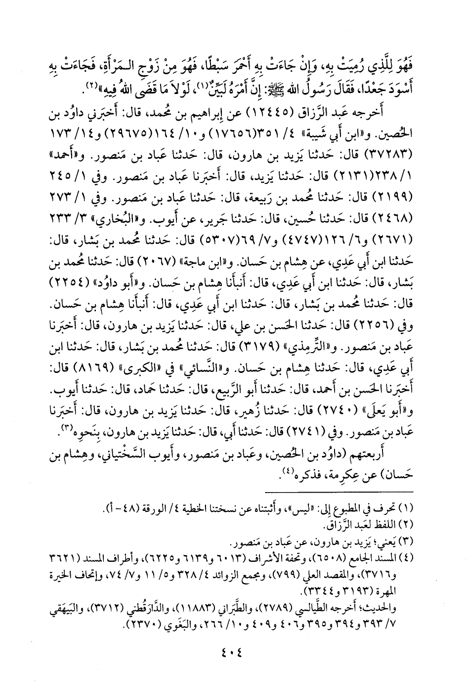 أخرجه عبد الرزاق (١٢٤٤٥) عن إبراهيم بن محمد، قال: أخبرني داود بن الحُصين. و «ابن أبي شيبة» (١٧٦٥٦) و ١٠/ ١٦٤ (٢٩٦٧٥) و ١٤/ ١٧٣ (٣٧٢٨٣) قال: حدثنا يزيد بن هارون، قال: حدثنا عباد بن منصور. و «أحمد» (٢١٣١) قال: حدثنا يزيد، قال: أخبرنا عباد بن منصور. وفي ١/ ٢٤٥ (٢١٩٩) قال: حدثنا محمد بن ربيعة، قال: حدثنا عباد بن منصور. وفي ١/ ٢٧٣ (٢٤٦٨) قال: حدثنا حسين، قال: حدثنا جرير، عن أيوب. و «البخاري» ٣/ ١٧٨ (٢٦٧١) و ٦/ ١٠٠ (٤٧٤٧) و ٧/ ٥٣ (٥٣٠٧) قال: حدثنا محمد بن بشار، قال: حدثنا ابن أَبي عَدي، عن هشام بن حسان. و «ابن ماجة» (٢٠٦٧) قال: حدثنا محمد بن بشار، قال: حدثنا ابن أَبي عَدي، قال: أنبأنا هشام بن حسان. و «أَبو داود» (٢٢٥٤) قال: حدثنا محمد بن بشار، قال: حدثنا ابن أَبي عَدي، قال: أنبأنا هشام بن حسان. وفي (٢٢٥٦) قال: حدثنا الحسن بن علي، قال: حدثنا يزيد بن هارون، قال: أخبرنا عباد بن منصور. و «التِّرمِذي» (٣١٧٩) قال: حدثنا محمد بن بشار، قال: حدثنا ابن أَبي عَدي، قال: حدثنا هشام بن حسان. و «النَّسَائي» في «الكبرى» (٨١٦٩) قال: أخبرنا الحسن بن أحمد، قال: حدثنا أَبو الربيع، قال: حدثنا حماد، قال: حدثنا أيوب. و «أَبو يَعلى» (٢٧٤٠) قال: حدثنا زهير، قال: حدثنا يزيد بن هارون، قال: أخبرنا عباد بن منصور. وفي (٢٧٤١) قال: حدثنا أبي، قال: حدثنا يزيد بن هارون، بنحوه (¬١).