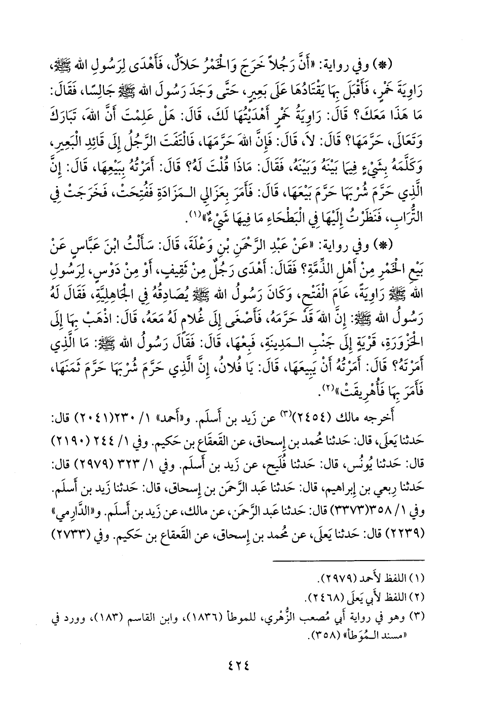 - وفي رواية: «عن عبد الرَّحمَن بن وَعلَة، قال: سألت ابن عباس عن بيع الخمر من أهل الذمة؟ فقال: أهدى رجل من ثقيف، أو من دوس، لرسول الله صَلى الله عَليه وسَلم راوية، عام الفتح، وكان رسول الله صَلى الله عَليه وسَلم يصادقه في الجاهلية، فقال له رسول الله صَلى الله عَليه وسَلم: إن الله قد حرمه، فأصغى إلى غلام له معه، قال: اذهب بها إلى الحَزوَّرة، قرية إلى جنب المدينة، فبعها، قال: فقال رسول الله صَلى الله عَليه وسَلم: ما الذي أمرته؟ قال: أمرته أن يبيعها، قال: يا فلان، إن الذي حرم شربها حرم ثمنها، فأمر بها فأهريقت» (¬١).