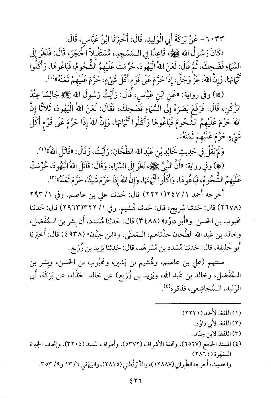 - وفي رواية: «عن ابن عباس، قال: رأيت رسول الله صَلى الله عَليه وسَلم جالسا عند الركن، قال: فرفع بصره إلى السماء فضحك، فقال: لعن الله اليهود، ثلاثا إن الله حرم عليهم الشحوم فباعوها وأكلوا أثمانها، وإن الله إذا حرم على قوم أكل شيء حرم عليهم ثمنه».