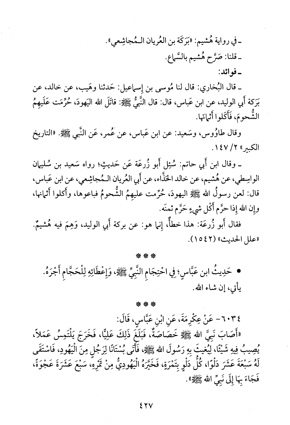 - قال البخاري: قال لنا موسى بن إِسماعيل: حدثنا وُهَيب، عن خالد، عن بَركة أَبي الوليد، عن ابن عباس، قال: قال النبي صَلى الله عَليه وسَلم: قاتل الله اليهود، حُرِّمَت عليهم الشحوم، فأَكلوا أَثمانها.
