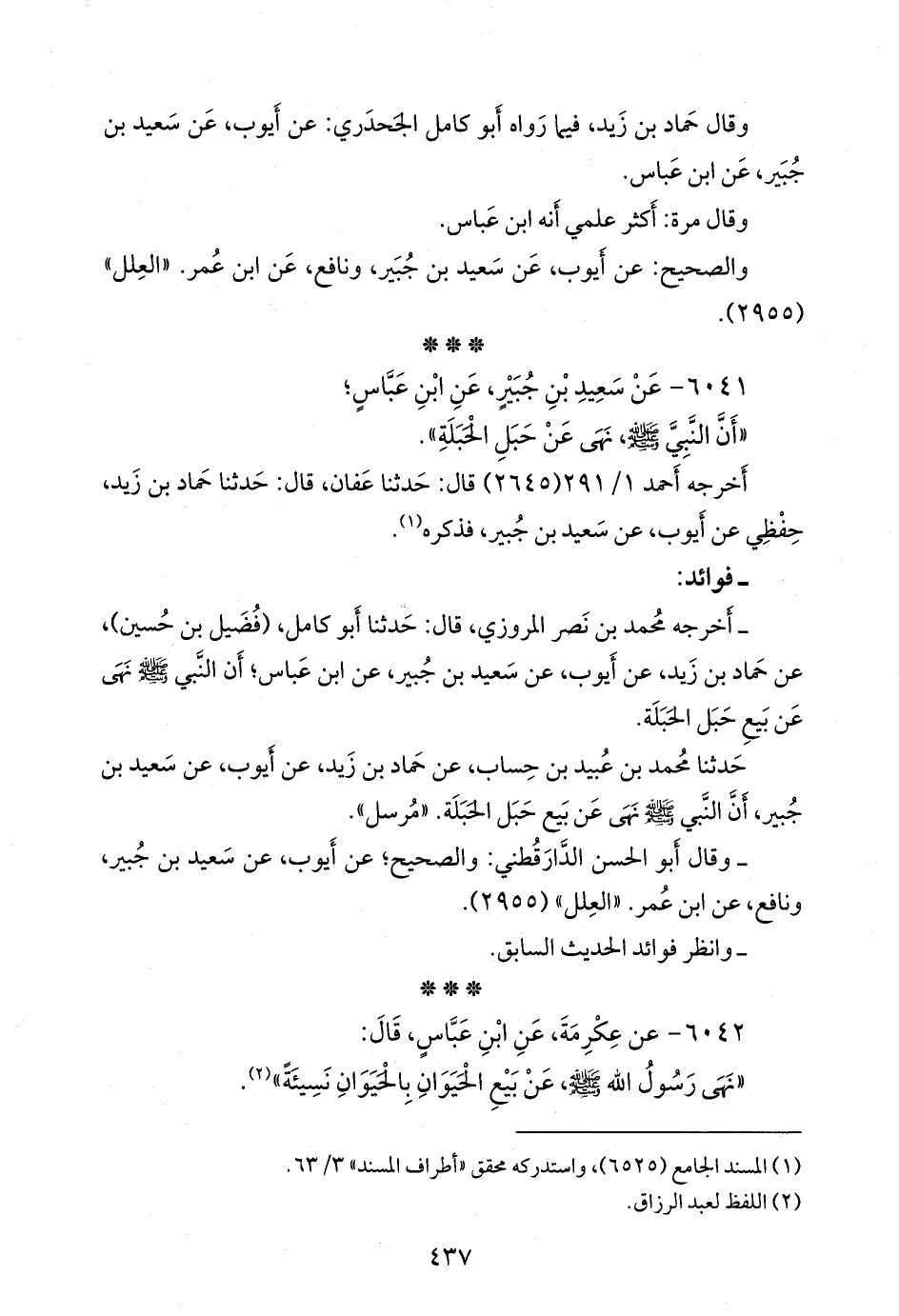 - قلنا: إِسناده ضعيفٌ؛ أَخرجه التِّرمِذي في «السُّنن» (١٢٢٩) من طريق حماد بن زيد، عن أَيوب، عن نافع، عن ابن عمر، أَن النبي صَلى الله عَليه وسَلم نَهى عن بَيع حَبل الحَبلة.