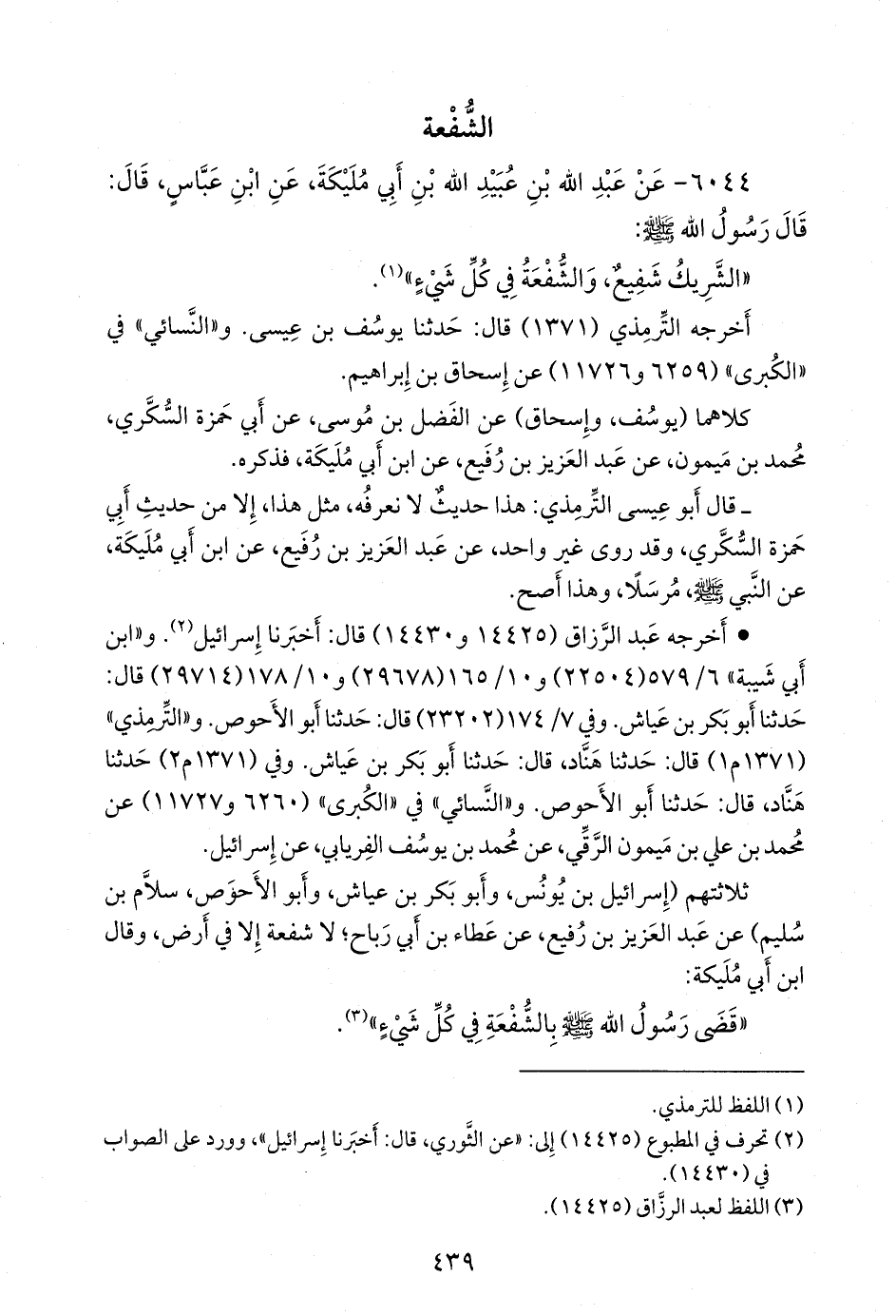 - وفي رواية: «عن ابن أَبي مُليكة، قال: قال رسول الله صَلى الله عَليه وسَلم: الشريك شفيع في كل شيء» (¬٢).