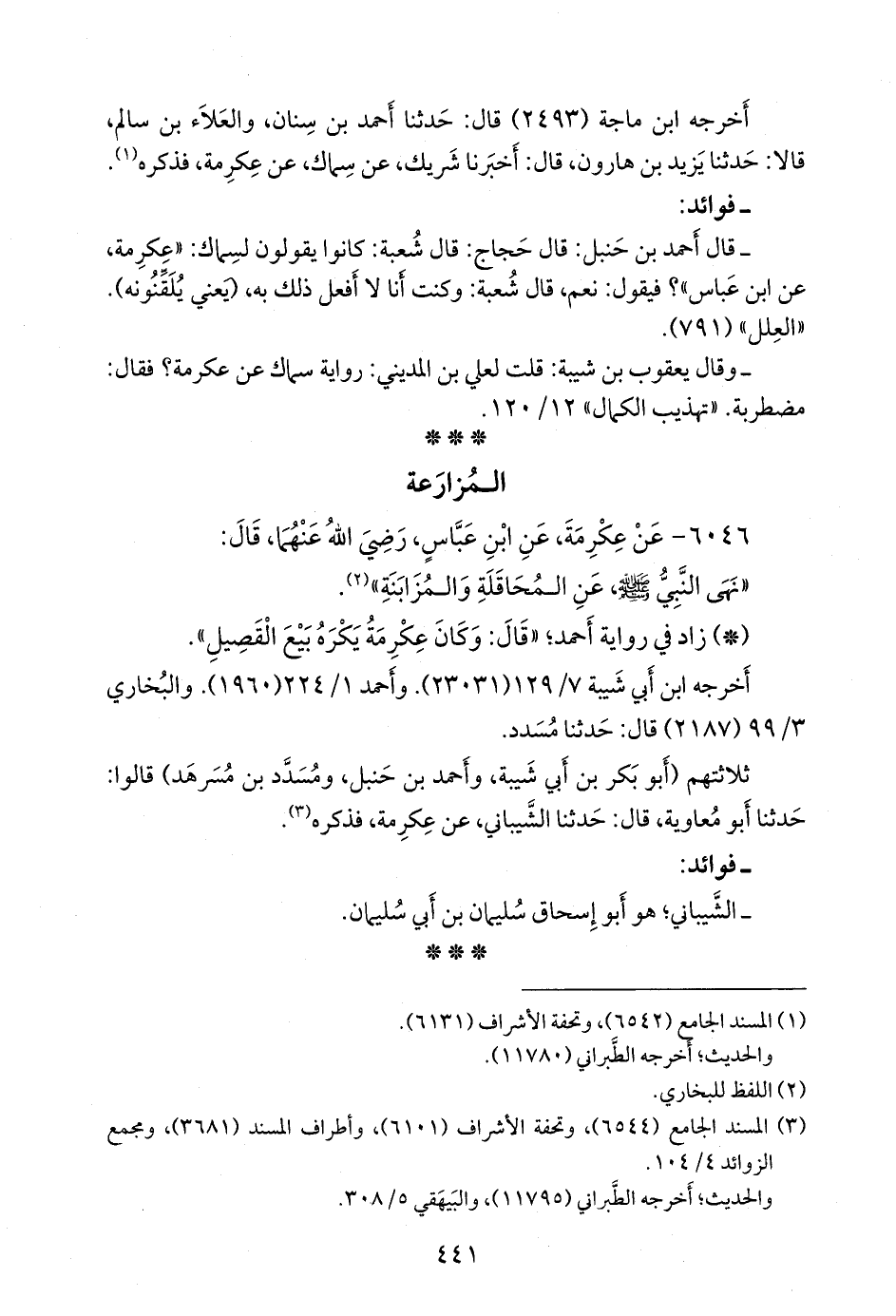 ثلاثتهم (أَبو بكر بن أبي شيبة، وأحمد بن حنبل، ومُسَدَّد بن مسرهد) عن أبي معاوية محمد بن خازم، قال: حدثنا الشيباني، عن عكرمة، فذكره (¬٢).