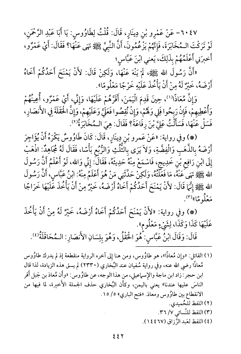 ٦٠٤٧ - عن عَمرو بن دينار، قال: قلت لطاووس: يا أبا عبد الرَّحمَن، لو تركت المخابرة، فإنهم يزعمون، أن النبي صَلى الله عَليه وسَلم نهى عنها؟ فقال: أي عَمرو، أخبرني أعلمهم بذلك، يعني ابن عباس؛