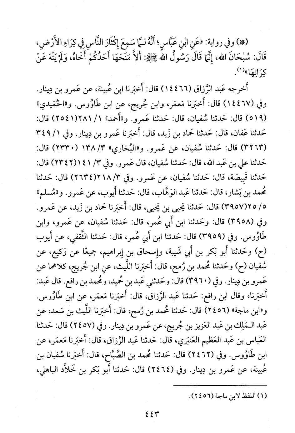 أخرجه عبد الرزاق (١٤٤٦٦) قال: أخبرنا ابن عُيينة، عن عَمرو بن دينار. وفي (١٤٤٦٧) قال: أخبرنا معمر، وابن جُريج، عن ابن طاووس. و «الحميدي» (٥١٩) قال: حدثنا سفيان, قال: حدثنا عَمرو. و «أحمد» (٢٥٤١) قال: حدثنا عفان, قال: حدثنا حماد بن زيد، قال: أخبرنا عَمرو بن دينار. وفي ١/ ٣٤٩ (٣٢٦٣) قال: حدثنا سفيان، عن عَمرو. و «البخاري» ٣/ ١٠٥ (٢٣٣٠) قال: حدثنا علي بن عبد الله، قال: حدثنا سفيان، قال عَمرو. وفي ٣/ ١٠٧ (٢٣٤٢) قال: حدثنا قَبيصَة، قال: حدثنا سفيان, عن عَمرو. وفي ٣/ ١٦٦ (٢٦٣٤) قال: حدثنا محمد بن بشار، قال: حدثنا عبد الوَهَّاب، قال: حدثنا أيوب, عن عَمرو. و «مسلم» ٥/ ٢٥ (٣٩٥٧) قال: حدثنا يحيى بن يحيى، قال: أخبرنا حماد بن زيد, عن عَمرو. وفي (٣٩٥٨) قال: وحدثنا ابن أبي عمر، قال: حدثنا سفيان, عن عَمرو، وابن طاووس. وفي (٣٩٥٩) قال: حدثنا ابن أبي عمر، قال: حدثنا الثقفي، عن أيوب (ح) وحدثنا أَبو بكر بن أبي شيبة، وإسحاق بن إبراهيم، جميعا عن وكيع، عن سفيان (ح) وحدثنا محمد بن رُمح، قال: أخبرنا الليث، عن ابن جُريج، كلهم عن عَمرو بن دينار. وفي (٣٩٦٠) قال: وحدثني عَبد بن حُميد, ومحمد بن رافع. قال عبد: أخبرنا، وقال ابن رافع: حدثنا عبد الرزاق، قال: أخبرنا مَعمَر، عن ابن طاووس. و «ابن ماجة» (٢٤٥٦) قال: حدثنا محمد بن رُمح، قال: أخبرنا الليث بن سعد، عن عبد الملك بن عبد العزيز بن جُريج، عن عَمرو بن دينار. وفي (٢٤٥٧) قال: حدثنا العباس بن عبد العظيم العنبري، قال: حدثنا عبد الرزاق، قال: أخبرنا مَعمَر، عن ابن طاووس. وفي (٢٤٦٢) قال: حدثنا محمد بن الصباح، قال: أخبرنا سفيان بن عُيينة, عن عَمرو بن دينار. وفي (٢٤٦٤) قال: حدثنا أَبو بكر بن خلاد الباهلي،