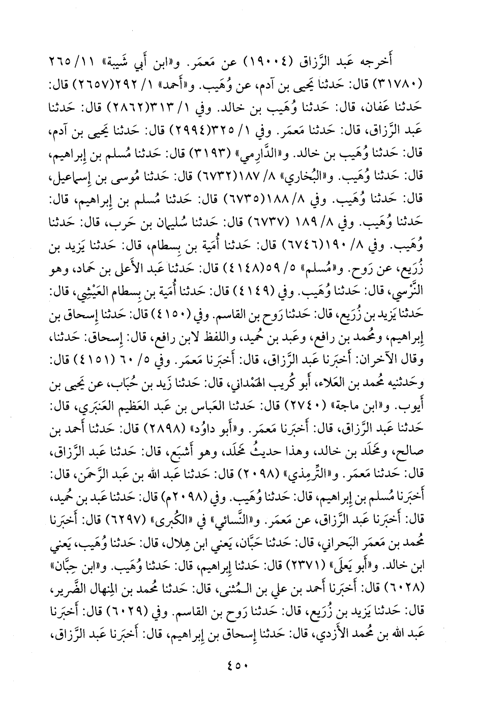 وفي (٤١٥٠) قال: حدثنا إسحاق بن إبراهيم، ومحمد بن رافع، وعَبد بن حُميد, واللفظ لابن رافع، قال: إسحاق: حدثنا، وقال الآخران: أخبرنا عبد الرزاق، قال: أخبرنا مَعمَر. وفي ٥/ ٦٠ (٤١٥١) قال: وحدثنيه محمد بن العلاء، أَبو كُريب الهمداني، قال: حدثنا زيد بن حباب، عن يحيى بن أيوب. و «ابن ماجة» (٢٧٤٠) قال: حدثنا العباس بن عبد العظيم العنبري، قال: حدثنا عبد الرزاق، قال: أخبرنا مَعمَر (¬١). و «أَبو داود» (٢٨٩٨) قال: حدثنا أحمد بن صالح، ومخلد بن خالد, وهذا حديث مخلد، وهو أشبع، قال: حدثنا عبد الرزاق، قال: حدثنا مَعمَر. و «التِّرمِذي» (٢٠٩٨) قال: حدثنا عبد الله بن عبد الرَّحمَن، قال: أخبرنا مسلم بن إبراهيم، قال: حدثنا وهيب. وفي (٢٠٩٨ م) قال: حدثنا عَبد بن حُميد، قال: أخبرنا عبد الرزاق، عن مَعمَر. و «النَّسَائي» في «الكبرى» (٦٢٩٧) قال: أخبرنا محمد بن معمر البحراني, قال: حدثنا حبان، يعني ابن هلال, قال: حدثنا وهيب، يعني ابن خالد. و «أَبو يَعلى» (٢٣٧١) قال: حدثنا إبراهيم, قال: حدثنا وهيب. و «ابن حِبَّان» (٦٠٢٨) قال: أخبرنا أحمد بن علي بن المثنى، قال: حدثنا محمد بن المنهال الضرير، قال: حدثنا يزيد بن زُريع، قال: حدثنا روح بن القاسم. وفي (٦٠٢٩) قال: أخبرنا عبد الله بن محمد الأزدي، قال: حدثنا إسحاق بن إبراهيم، قال: أخبرنا عبد الرزاق،