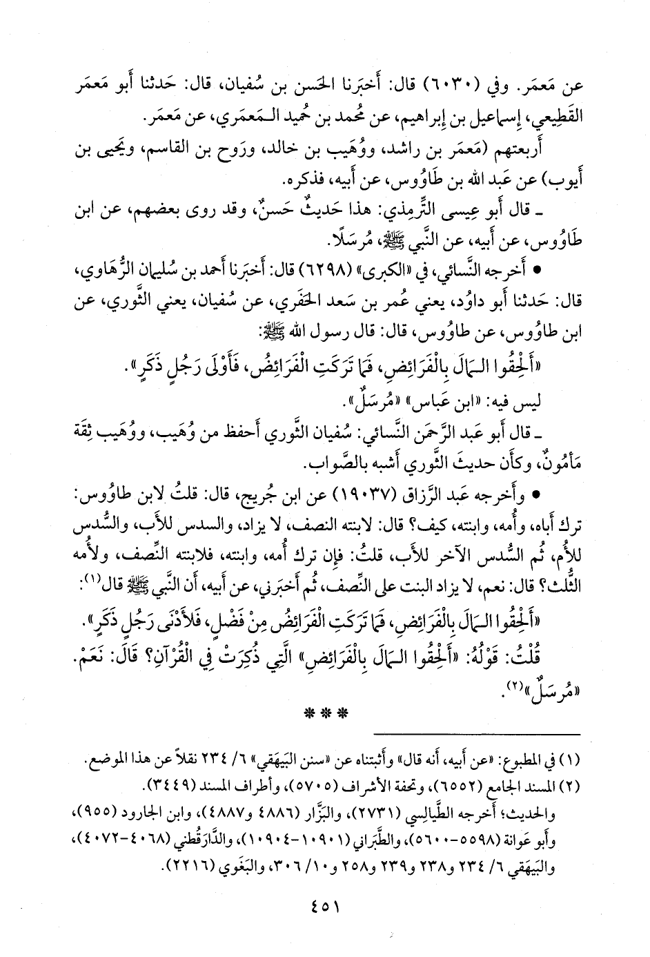- وأَخرجه عبد الرزاق (١٧١٩٩) عن ابن جريج، قال: قلت لاِبن طاووس: ترك أَباه وأُمه وابنته، كيف؟ قال: لاِبنته النصف لا يزاد، والسدس للأَب، والسدس للأُم، ثم السدس الآخر للأَب، قلت: فإِن ترك أُمه وابنته؟ فلابنته النصف، ولأُمه الثلث؟ قال: نعم، لا تزاد البنت على النصف، ثم أَخبرني عن أَبيه، أَنه قال (¬٢):أَلحقوا المال بالفرائِض، فما تركت الفرائِض من فضل فلأَدنى رجل ذَكَر، قلتُ (¬٣): قوله: أَلحقوا المال بالفرائِض التي ذكرت في القرآن؟ قال: نعم. «موقوف».