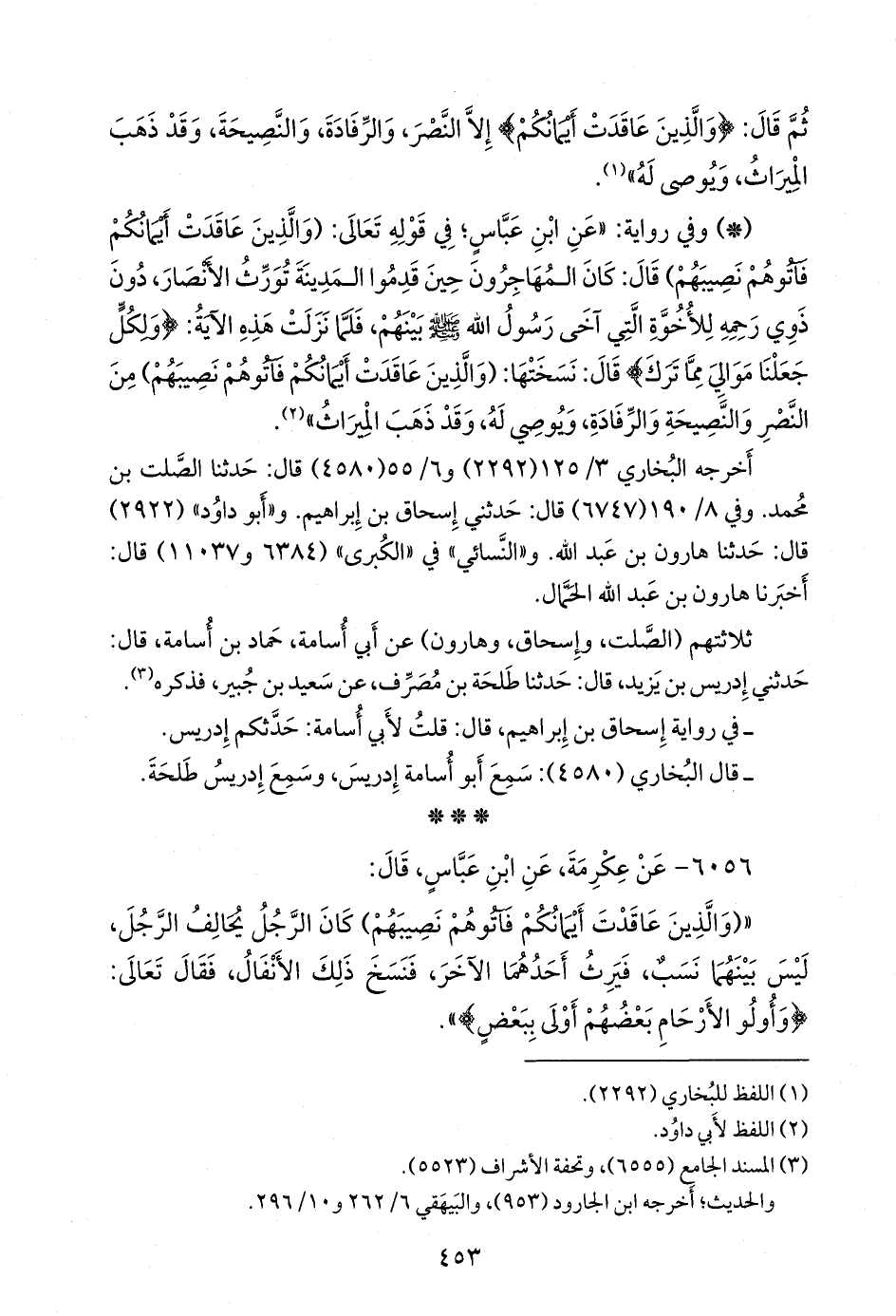 «(والذين عاقدت أيمانكم فآتوهم نصيبهم) كان الرجل يحالف الرجل، ليس بينهما نسب، فيرث أحدهما الآخر، فنسخ ذلك الأنفال، فقال تعالى: {وأولو الأرحام بعضهم أولى ببعض}».