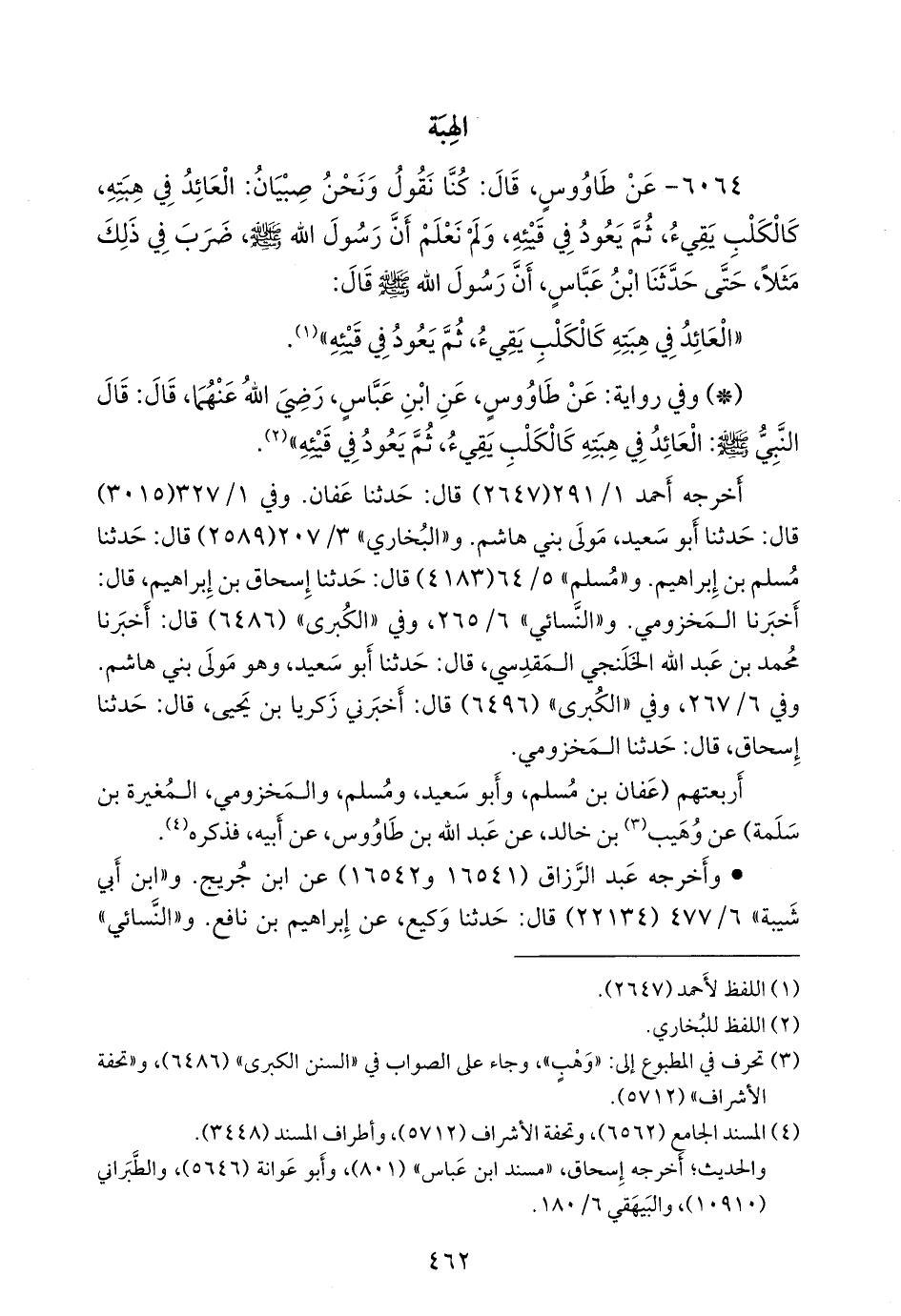 - وفي رواية: «عن طاووس، قال: كنت أسمع، وأنا غلام، الغِلمان يقولون: الذي يعود في هبته، كالكلب يعود في قيئه، ولا أشعر أن رسول الله صَلى الله عَليه وسَلم ضرب ذلك مثلا، حتى أخبرت به بعد، أن رسول الله صَلى الله عَليه وسَلم قال: إنما مثل الذي يهب، ثم يعود في هبته، مثل الكلب يقيء، ثم يأكل قيئه» (¬٢).