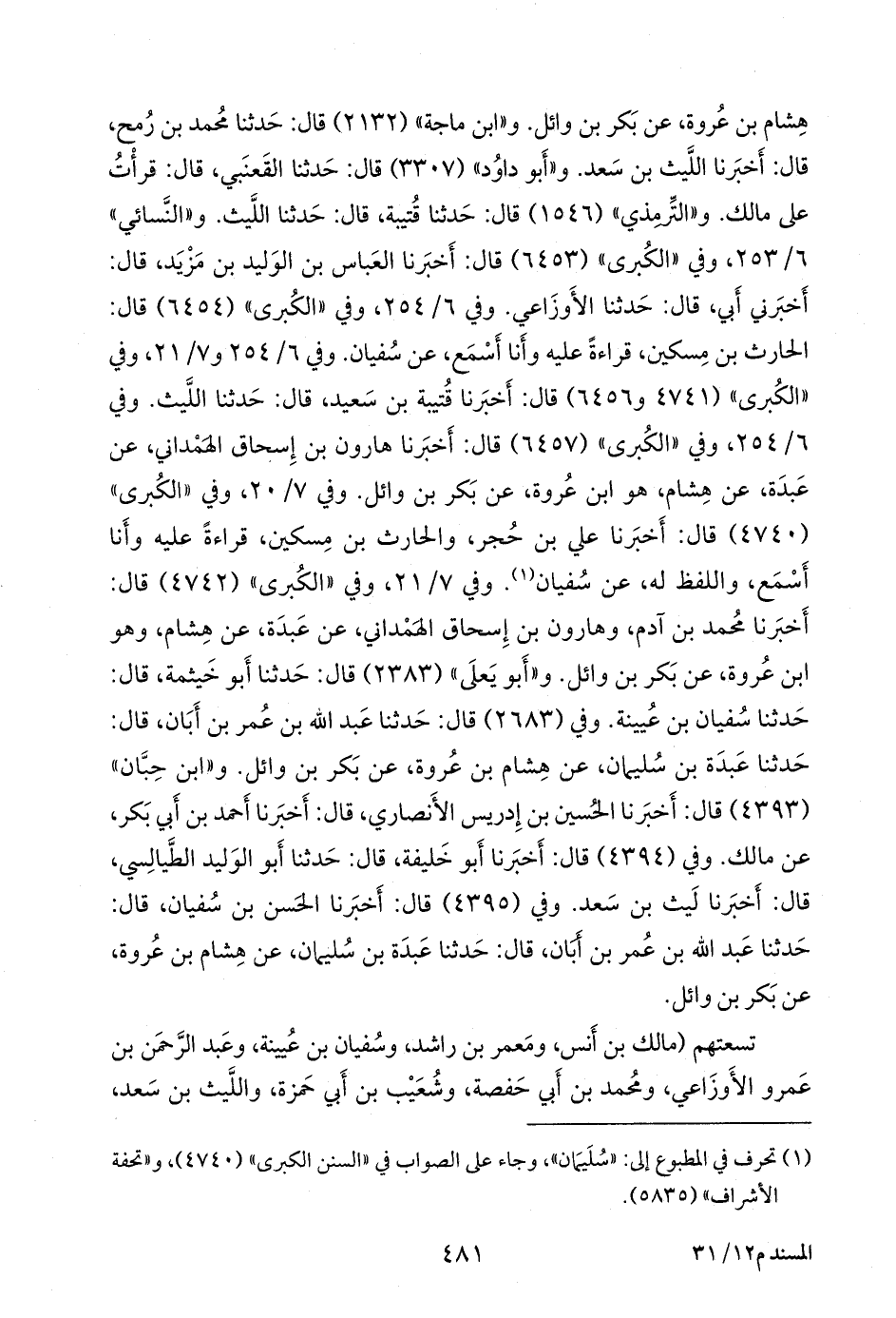 وفي ٧/ ٢١، وفي «الكبرى» (٤٧٤٢) قال: أخبرنا محمد بن آدم، وهارون بن إسحاق الهمداني، عن عبدة، عن هشام، وهو ابن عروة، عن بكر بن وائل. و «أَبو يَعلى» (٢٣٨٣) قال: حدثنا أَبو خيثمة، قال: حدثنا سفيان بن عُيينة. وفي (٢٦٨٣) قال: حدثنا عبد الله بن عمر بن أبان، قال: حدثنا عَبدة بن سليمان، عن هشام بن عروة، عن بكر بن وائل. و «ابن حِبَّان» (٤٣٩٣) قال: أخبرنا الحسين بن إدريس الأَنصاري، قال: أخبرنا أحمد بن أَبي بكر، عن مالك. وفي (٤٣٩٤) قال: أخبرنا أَبو خليفة، قال: حدثنا أَبو الوليد الطيالسي, قال: أخبرنا ليث بن سعد. وفي (٤٣٩٥) قال: أخبرنا الحسن بن سفيان, قال: حدثنا عبد الله بن عمر بن أبان, قال: حدثنا عَبدة بن سليمان، عن هشام بن عروة، عن بكر بن وائل.