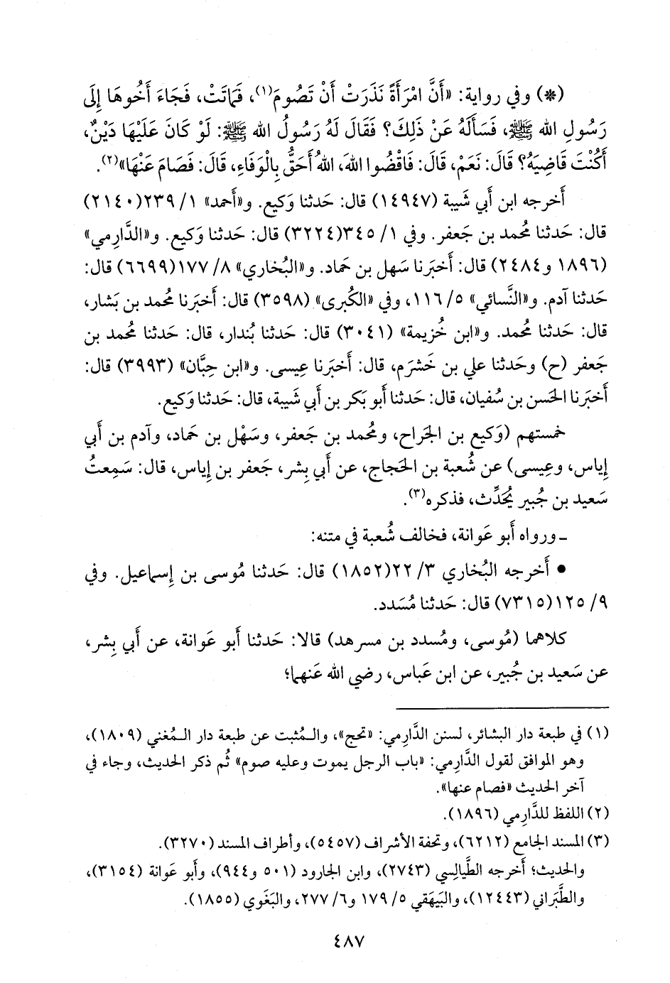 أخرجه ابن أبي شيبة (١٤٩٤٧) قال: حدثنا وكيع. و «أحمد» ١/ ٢٣٩ (٢١٤٠) قال: حدثنا محمد بن جعفر. وفي ١/ ٣٤٥ (٣٢٢٤) قال: حدثنا وكيع. و «الدارمي» (١٨٩٦ و ٢٤٨٤) قال: أخبرنا سهل بن حماد. و «البخاري» ٨/ ١٤٢ (٦٦٩٩) قال: حدثنا آدم. و «النَّسَائي» ٥/ ١١٦, وفي «الكبرى» (٣٥٩٨) قال: أخبرنا محمد بن بشار، قال: حدثنا محمد. و «ابن خزيمة» (٣٠٤١) قال: حدثنا بندار، قال: حدثنا محمد بن جعفر (ح) وحدثنا علي بن خَشرَم، قال: أخبرنا عيسى. و «ابن حِبَّان» (٣٩٩٣) قال: أخبرنا الحسن بن سفيان، قال: حدثنا أَبو بكر بن أبي شيبة، قال: حدثنا وكيع.