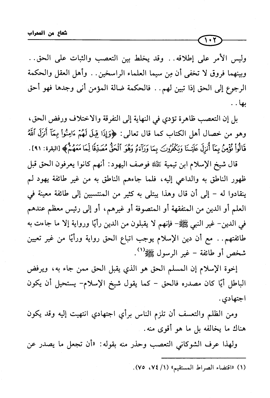 إخوة الإسلام إن المسلم الحق هو الذي يقبل الحق ممن جاء به، ويرفض الباطل أيًا كان مصدره فالحق - كما يقول شيخ الإسلام- يستحيل أن يكون اجتهادي.