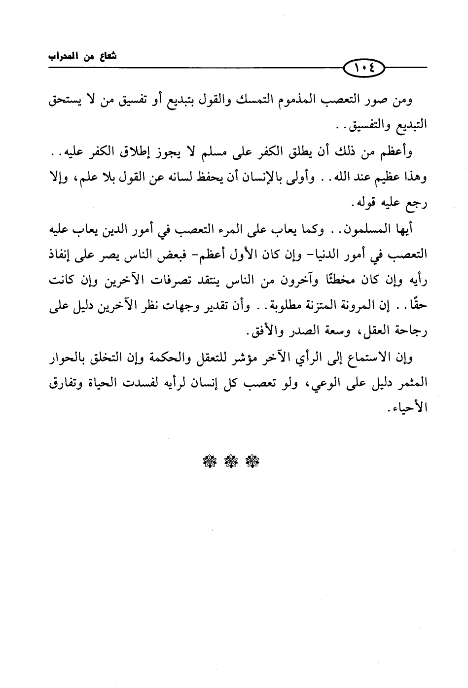 أيها المسلمون .. وكما يعاب على المرء التعصب في أمور الدين يعاب عليه التعصب في أمور الدنيا- وإن كان الأول أعظم- فبعض الناس يصر على إنفاذ رأيه وإن كان مخطئًا وآخرون من الناس ينتقد تصرفات الآخرين وإن كانت حقًا .. إن المرونة المتزنة مطلوبة .. وأن تقدير وجهات نظر الآخرين دليل على رجاحة العقل، وسعة الصدر والأفق.