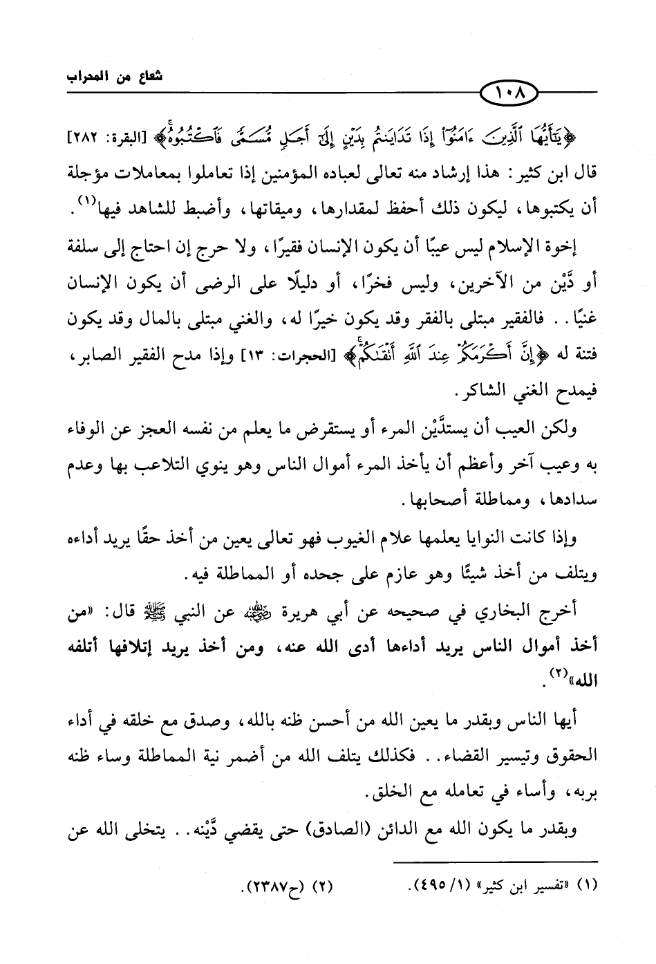 {يَا أَيُّهَا الَّذِينَ آمَنُوا إِذَا تَدَايَنتُم بِدَّيْن إِلَى أَجَلٍ مُّسَمًّى فَاكْتُبُوهُ .. } قال ابن كثير: هذا إرشاد منه تعالى لعباده المؤمنين إذا تعاملوا بمعاملات مؤجلة أن يكتبوها، ليكون ذلك أحفظ لمقدارها، وميقاتها، وأضبط للشاهد فيها (¬1).