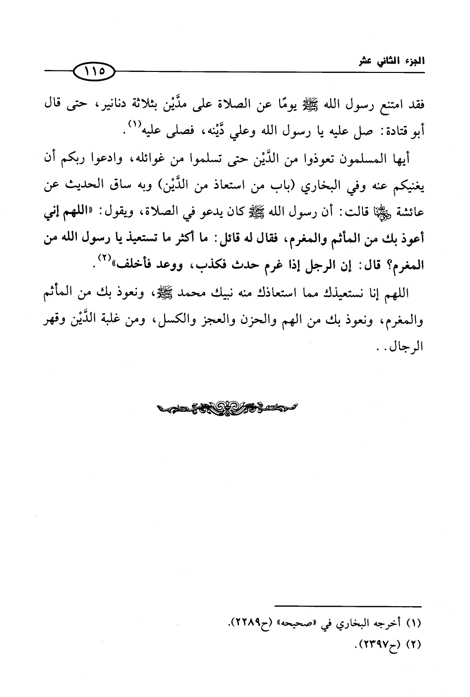 أيها المسلمون تعوذوا من الدَّيْن حتى تسلموا من غوائله، وادعوا ربكم أن يغنيكم عنه وفي البخاري (باب من استعاذ من الدَّيْن) وبه ساق الحديث عن عائشة رضي الله عنها قالت: أن رسول الله صلى الله عليه وسلم كان يدعو في الصلاة، ويقول: «اللهم إني أعوذ بك من المأثم والمغرم، فقال له قائل: ما أكثر ما تستعيذ يا رسول الله من المغرم؟ قال: إن الرجل إذا غرم حدث فكذب، ووعد فأخلف» (¬2).