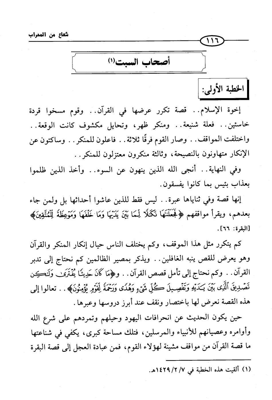 إخوة الإسلام .. قصة تكرر عرضها في القرآن .. وقوم مسخوا قردة خاسئين .. فعلة شنيعة .. ومنكر ظهر، وتحايل مكشوف كانت الوقعة .. واختلفت المواقف .. وصار القوم فرقًا ثلاثة .. فاعلون للمنكر .. وساكتون عن الإنكار متهاونون بالنصيحة، وثالثة منكرون معتزلون للمنكر ..
