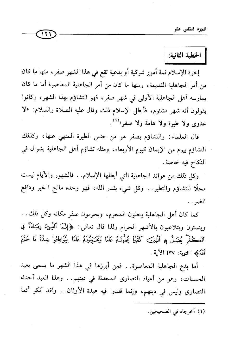 إخوة الإسلام ثمة أمور شركية أو بدعية تقع في هذا الشهر صفر، منها ما كان من أمر الجاهلية القديمة، ومنها ما كان من أمر الجاهلية المعاصرة أما ما كان يمارسه أهل الجاهلية الأولى في شهر صفر، فهو التشاؤم بهذا الشهر، وكانوا يقولون أنه شهر مشئوم، فأبطل الإسلام ذلك وقال عليه الصلاة والسلام: «لا عدوى ولا طيرة ولا هامة ولا صفر» (¬1).