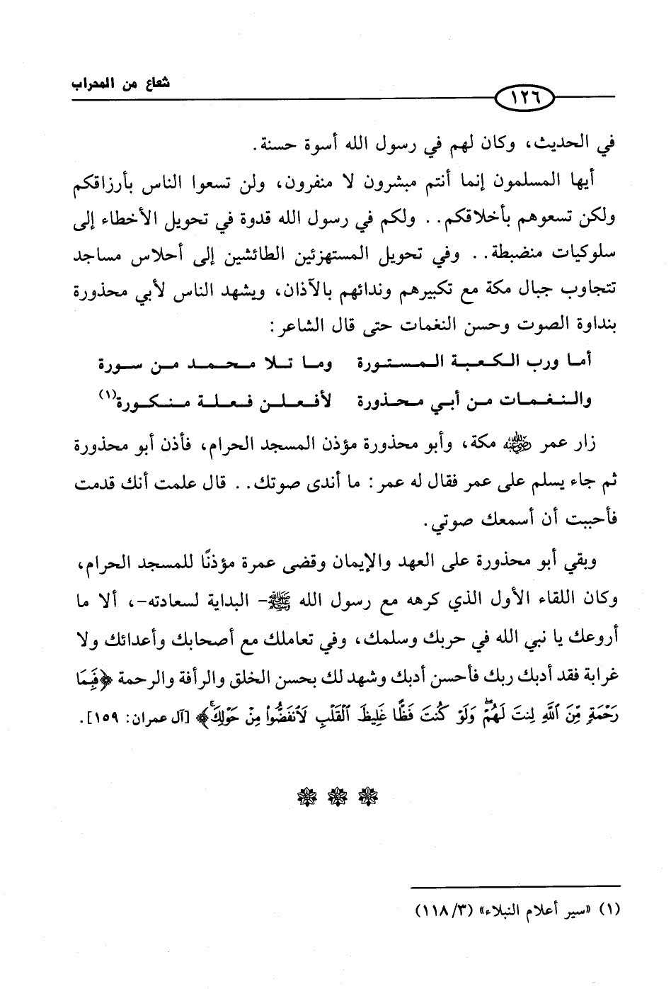أيها المسلمون إنما أنتم مبشرون لا منفرون، ولن تسعوا الناس بأرزاقكم ولكن تسعوهم بأخلاقكم .. ولكم في رسول الله قدوة في تحويل الأخطاء إلى سلوكيات منضبطة .. وفي تحويل المستهزئين الطائشين إلى أحلاس مساجد تتجاوب جبال مكة مع تكبيرهم وندائهم بالآذان، ويشهد الناس لأبي محذورة بنداوة الصوت وحسن النغمات حتى قال الشاعر: