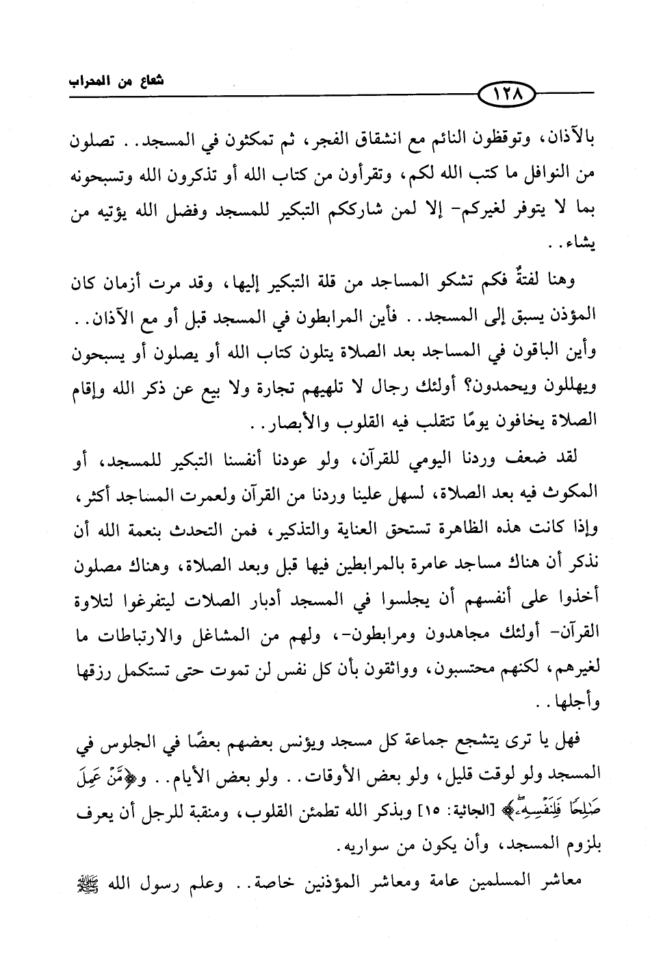 وهنا لفتةٌ فكم تشكو المساجد من قلة التبكير إليها، وقد مرت أزمان كان المؤذن يسبق إلى المسجد .. فأين المرابطون في المسجد قبل أو مع الآذان .. وأين الباقون في المساجد بعد الصلاة يتلون كتاب الله أو يصلون أو يسبحون ويهللون ويحمدون؟ أولئك رجال لا تلهيهم تجارة ولا بيع عن ذكر الله وإقام الصلاة يخافون يومًا تتقلب فيه القلوب والأبصار ..