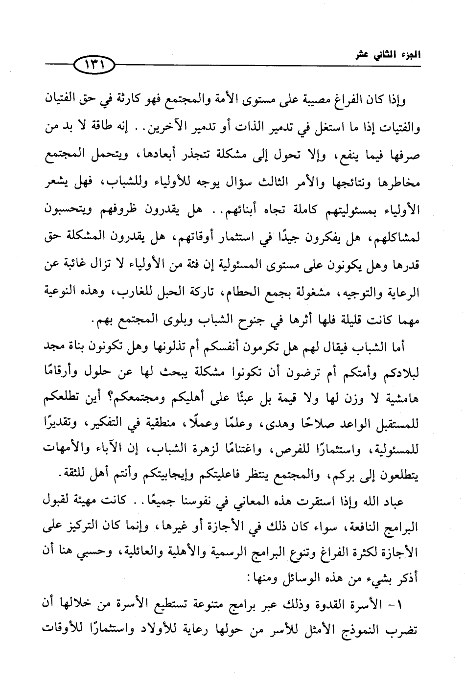 عباد الله وإذا استقرت هذه المعاني في نفوسنا جميعًا .. كانت مهيئة لقبول البرامج النافعة، سواء كان ذلك في الأجازة أو غيرها، وإنما كان التركيز على الأجازة لكثرة الفراغ وتنوع البرامج الرسمية والأهلية والقائلية، وحسبي هنا أن أذكر بشيء من هذه الوسائل ومنها: