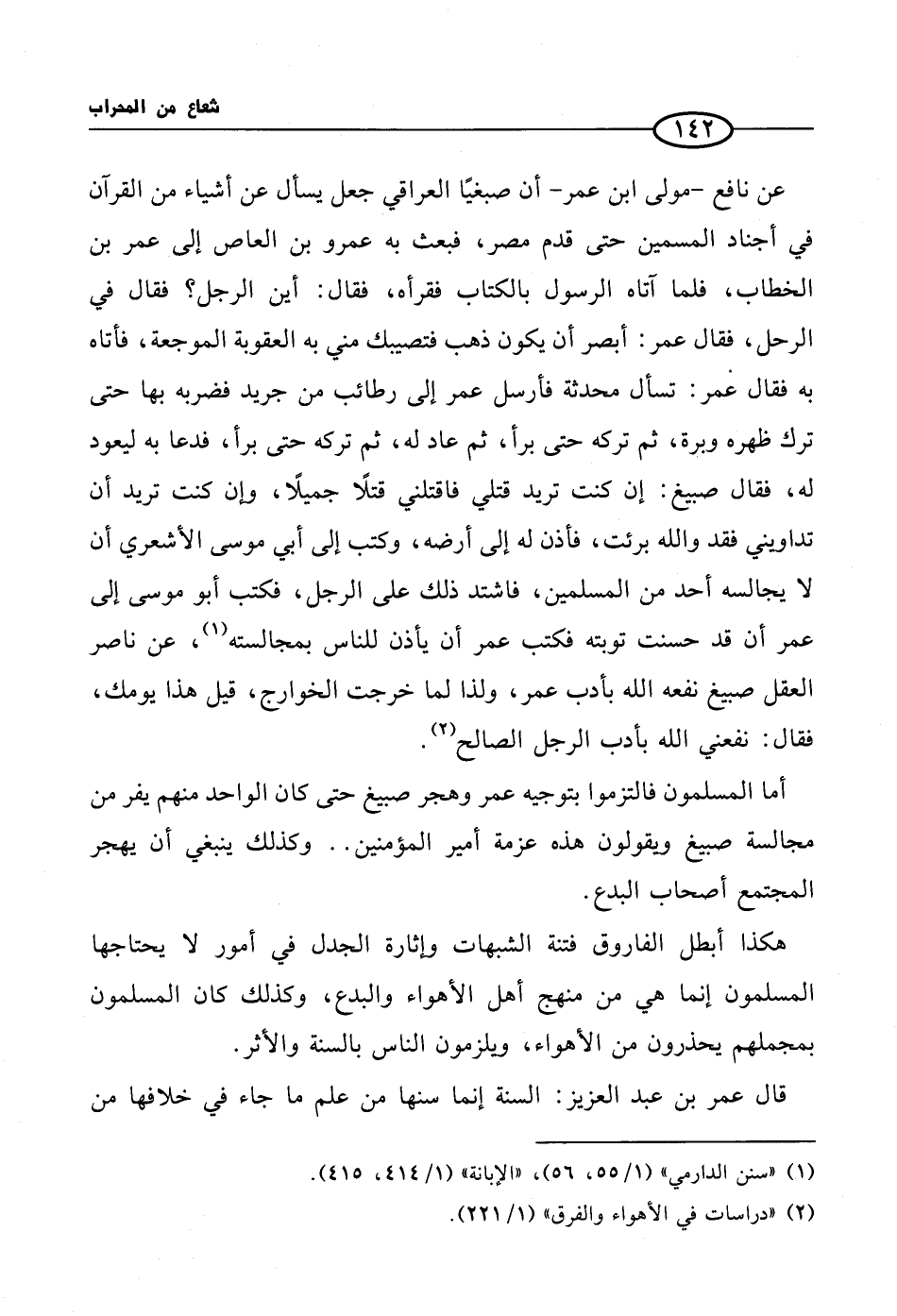عن نافع- مولى ابن عمر- أن صبغيًا العراقي جعل يسأل عن أشياء من القرآن في أجناد المسمين حتى قدم مصر، فبعث به عمرو بن العاص إلى عمر بن الخطاب، فلما آتاه الرسول بالكتاب فقرأه، فقال: أين الرجل؟ فقال في الرحل، فقال عمر: أبصر أن يكون ذهب فتصيبك مني به العقوبة الموجعة، فأتاه به فقال عمر: تسأل محدثة فأرسل عمر إلى رطائب من جريد فضربه بها حتى ترك ظهره وبرة، ثم تركه حتى برأ، ثم عاد له، ثم تركه حتى برأ، فدعا به ليعود له، فقال صبيغ: إن كنت تريد قتلي فاقتلني قتلًا جميلًا، وإن كنت تريد أن تداويني فقد والله برئت، فأذن له إلى أرضه، وكتب إلى أبي موسى الأشعري أن لا يجالسه أحد من المسلمين، فاشتد ذلك على الرجل، فكتب أبو موسى إلى عمر أن قد حسنت توبته فكتب عمر أن يأذن للناس بمجالسته (¬1)، عن ناصر العقل صبيغ نفعه الله بأدب عمر، ولذا لما خرجت الخوارج قيل هذا يومك، فقال: نفعني الله بأدب الرجل الصالح (¬2).