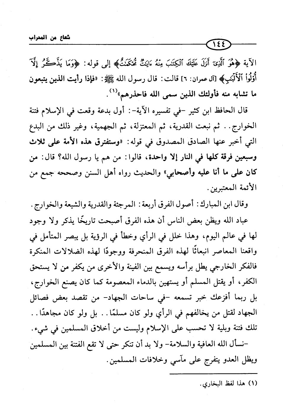 عباد الله ويظن بعض الناس أن هذه الفرقة أصبحت تاريخًا يذكر ولا وجود لها في عالم اليوم، وهذا خلل في الرأي وخطأ في الرؤية بل يبصر المتأمل في واقعنا المعاصر انبعاثًا لهذه الفرقة المنحرفة ووجودًا لهذه الضلالات المنكرة فالفكر الخارجي يظل برأسه ويسمع بين الفينة والأخرى من يكفر من لا يستحق الكفر، أو تقتل المسلم أو يستهين بالدماء المعصومة لما كان يصنع الخوارج، بل ربما أفزعك خبر تسمعه- في ساحات الجهاد- من تقصد بعض فضائل الجهاد لقتل من يخالفهم في الرأي ولو كان مسلمًا .. بل ولو كان مجاهدًا .. تلك فتنة وبلية لا تحسب على الإسلام وليست من أخلاق المسلمين في شيء.