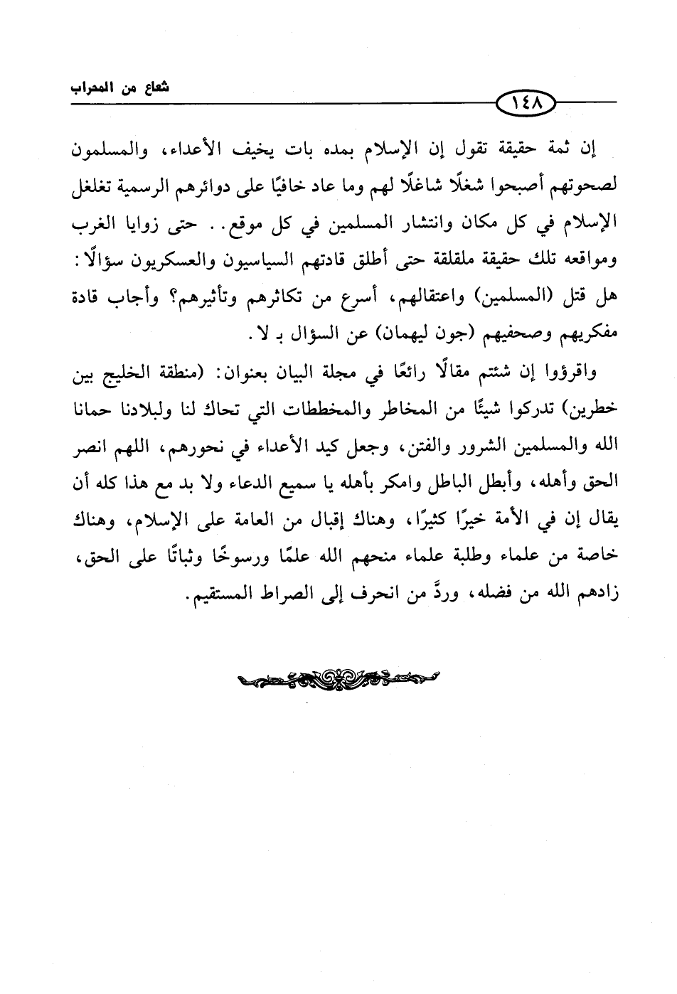واقرؤوا إن شئتم مقالًا رائعًا في مجلة البيان بعنوان: منطقة الخليج بن خطرين تدركوا شيئًا من المخاطر والمخططات التي تحاك لنا ولبلادنا حمانا الله والمسلمين الشرور والفتن، وكان الأعداء في نحورهم اللهم انصر الحق وأهله، وأبطل الباطل وامكر بأهله يا سميع الدعاء ولا بد مع هذا كله أن يقال إن في الأمة خيرًا كثيرًا، وهناك إقبال من العامة على الإسلام، وهناك خاصة من علماء وطلبة علماء منحهم الله علمًا ورسوخًا وثباتًا على الحق، زادهم الله من فضله، ورد من انحرف إلى صراط مستقيم.