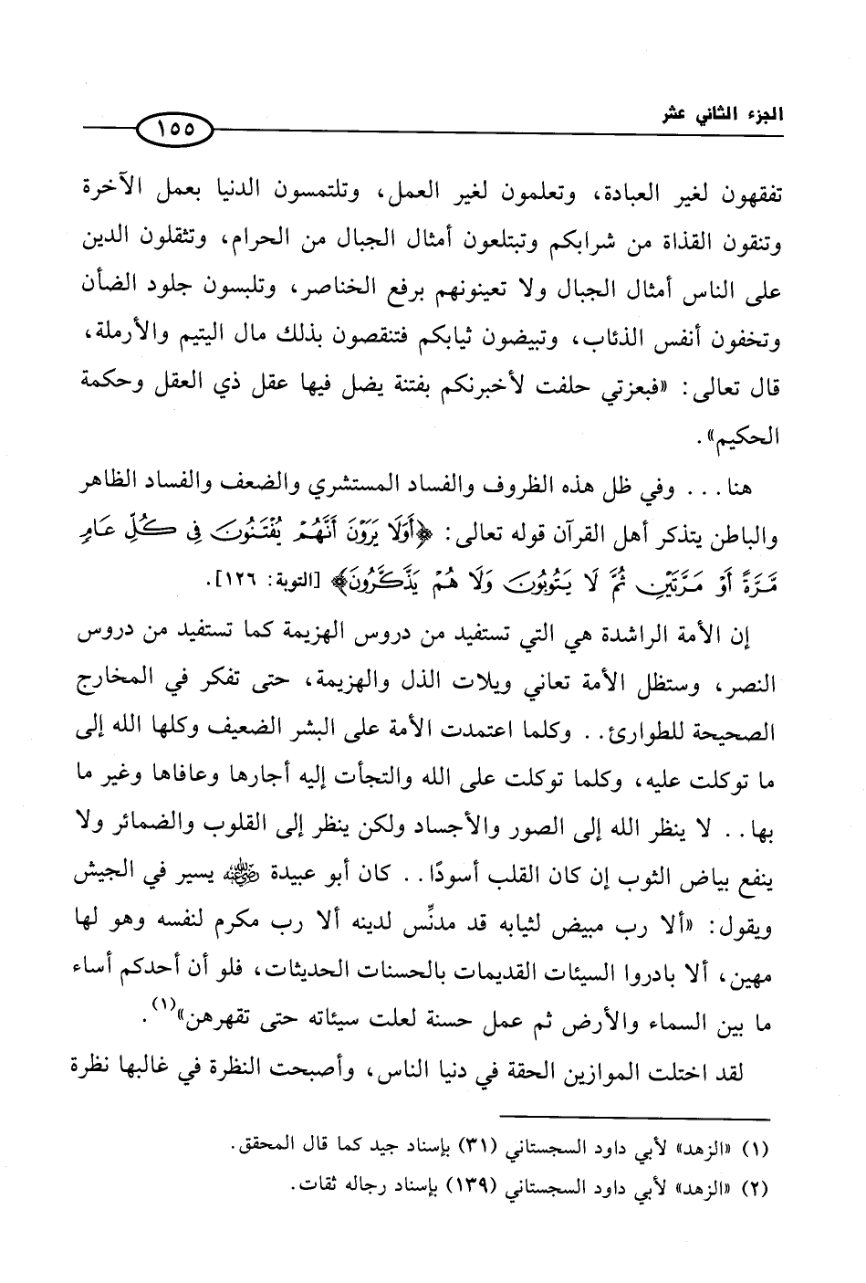 إن الأمة الراشدة هي التي تستفيد من دروس الهزيمة كما تستفيد من دروس النصر، وستظل الأمة تعاني ويلات الذل والهزيمة، حتى تفكر في المخارج الصحيحة للطوارئ .. وكلما اعتمدت الأمة على البشر الضعيف وكلها الله إلى ما توكلت عليه، وكلما توكلت على الله والتجأت إليه أجارها وعافاها وغير ما بها .. لا ينظر الله إلى الصور والأجساد ولكن ينظر إلى القلوب والضمائر ولا ينفع بياض الثوب إن كان القلب أسودًا .. كان أبو عبيدة رضي الله عنه يسير في الجيش ويقول: «ألا رب فبيض لثيابه قد دنس لدينه ألا رب مكرم لنفسه وهو لها مهين، ألا بادروا السيئات القديمات بالحسنات الحديثات، فلو أن أحدكم أساء ما بين السماء والأرض ثم عمل حسنة لعلت سيئاته حتى تقهرهن» (¬2).