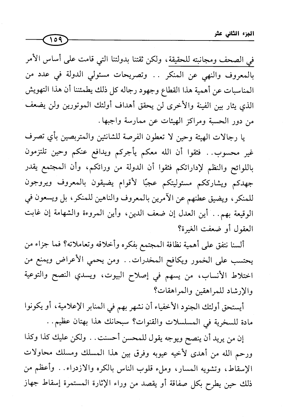 في الصحف ومجانبته للحقيقة ولكن ثقتنا بدولتنا التي قامت على أساس الأمر بالمعروف والنهي عن المنكر .. وتصريحات مسئولي الدولة في عدد من المناسبات عن أهمية هذا القطاع وجهود رجاله كل ذلك يطمئننا أن هذا التهويش الذي يثار بين الفينة والأخرى لن يحقق أهداف أولئك الموتورين ولن يضعف من دور الحسبة ومراكز الهيئات عن ممارسة واجبها يا رجالات الهيئة وحين لا تعطون الفرصة للشانئين والمتربصين بأي تصرف غير محسوب .. فثقوا أن الله معكم يأجركم ويدافع عنكم وحين تلتزمون باللوائح والنظم لإداراتكم فثقوا أن الدولة من ورائكم، وأن المجتمع يقدر جهدكم ويشارككم مسئوليتكم عجبًا لأقوام يضيقون بالمعروف ويروجون للمنكر، ويضيق عطنهم عن الآمرين بالمعروف والناهين للمنكر، بل ويسعون في الوقيعة بهم .. أين العدل إن ضعف الدين، وأين المروءة والشهامة إن غابت العقول أو ضعفت الغيرة؟