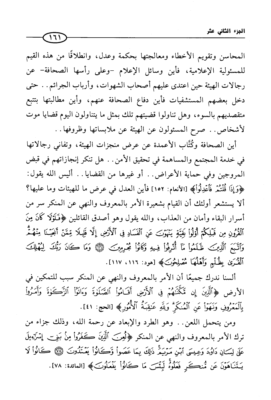 أين الصحافة وكُتَّاب الأعمدة عن عرض منجزات الهيئة، وتفاني رجالاتها في خدمة المجتمع والمساهمة في تحقيق الأمن .. هل تنكر إنجازاتهم في قبض المروجين وفي حماية الأعراض .. أو غيرها من القضايا .. أليس الله يقول: {وإذا قلتم فاعدلوا} فأين العدل في عرض ما للهيئات وما عليها؟ ألا يستشعر أولئك أن القيام بشعيرة الأمر بالمعروف والنهي عن المنكر سر من أسرار البقاء وأمان من العذاب، والله يقول وهو أصدق القائلين {فَلَوْلاَ كَانَ مِنَ الْقُرُونِ مِن قَبْلِكُمْ أُوْلُوا بَقِيَّةٍ يَنْهَوْنَ عَنِ الْفَسَادِ فِي الأَرْضِ إِلاَّ قَلِيلًا مِّمَّنْ أَنجَيْنَا مِنْهُمْ وَاتَّبَعَ الَّذِينَ ظَلَمُوا مَا أُتْرِفُوا فِيهِ وَكَانُوا مُجْرِمِينَ (116) وَمَا كَانَ رَبُّكَ لِيُهْلِكَ الْقُرَى بِظُلْمٍ وَأَهْلُهَا مُصْلِحُونَ} [هود: 116، 117]