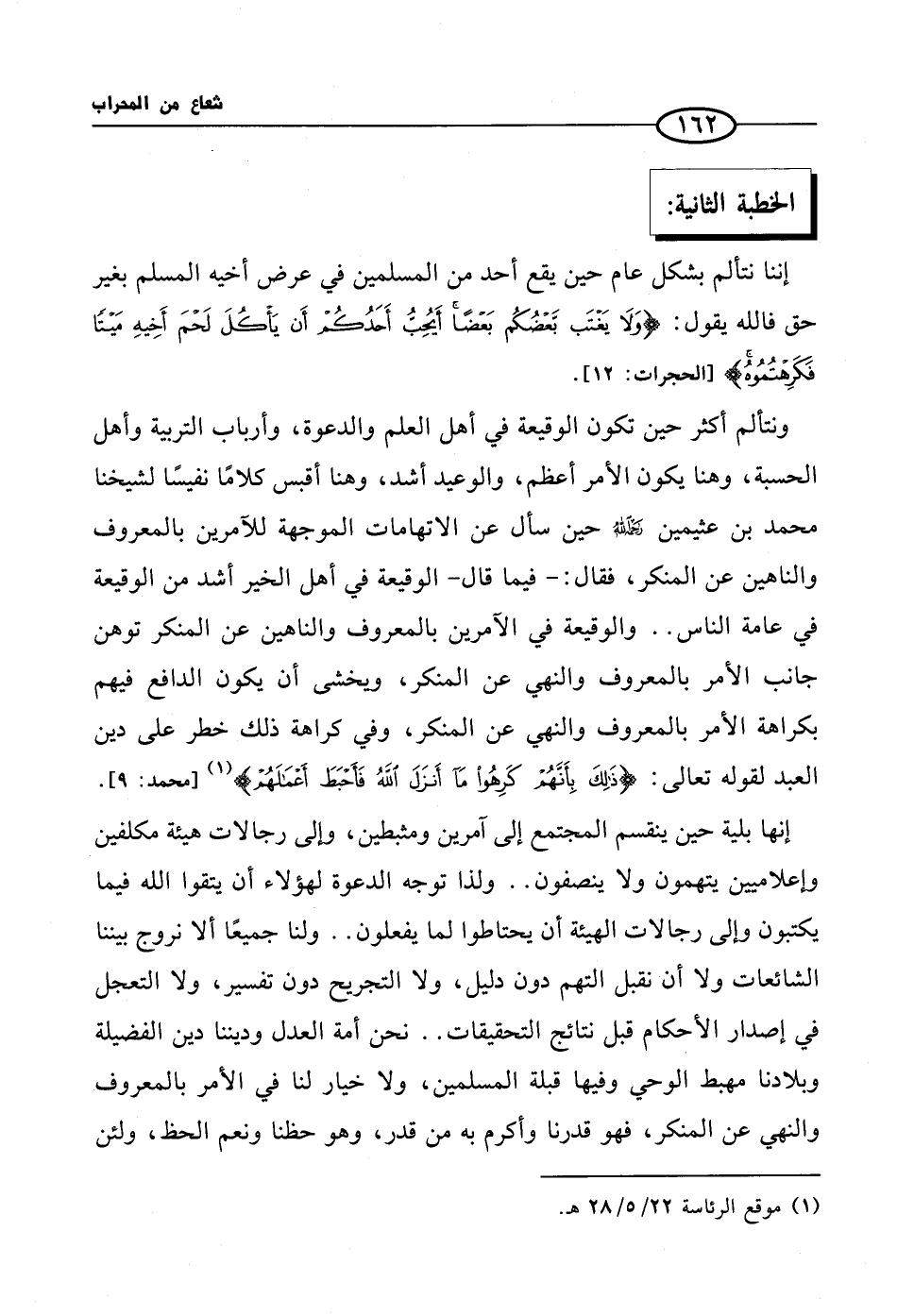 ويتألم أكثر حين تكون الوقيعة في أهل العلم والدعوة، وأرباب التربية وأهل الحسبة، وهنا يكون الأمر أعظم، والوعيد أشد، وهنا أقبس كلامًا نفيسًا لشيخنا محمد بن عثيمين رحمه الله حين سأل عن الاتهامات الموجهة للآمرين بالمعروف والناهين عن المنكر، فقال: - فيما قال- الوقيعة في أهل الخير أشد من الوقيعة في عامة الناس .. والوقيعة في الآمرين بالمعروف والناهين عن المنكر توهن جانب الأمر بالمعروف والنهي عن المنكر، ويخشى أن يكون الدافع فيهم بكراهة الأمر بالمعروف والنهي عن المنكر، وفي كراهة ذلك خطر على دين العبد لقوله تعالى: {ذَلِكَ بِأَنَّهُمْ كَرِهُوا مَا أَنزَلَ اللَّهُ فَأَحْبَطَ أَعْمَالَهُمْ} (¬1).
