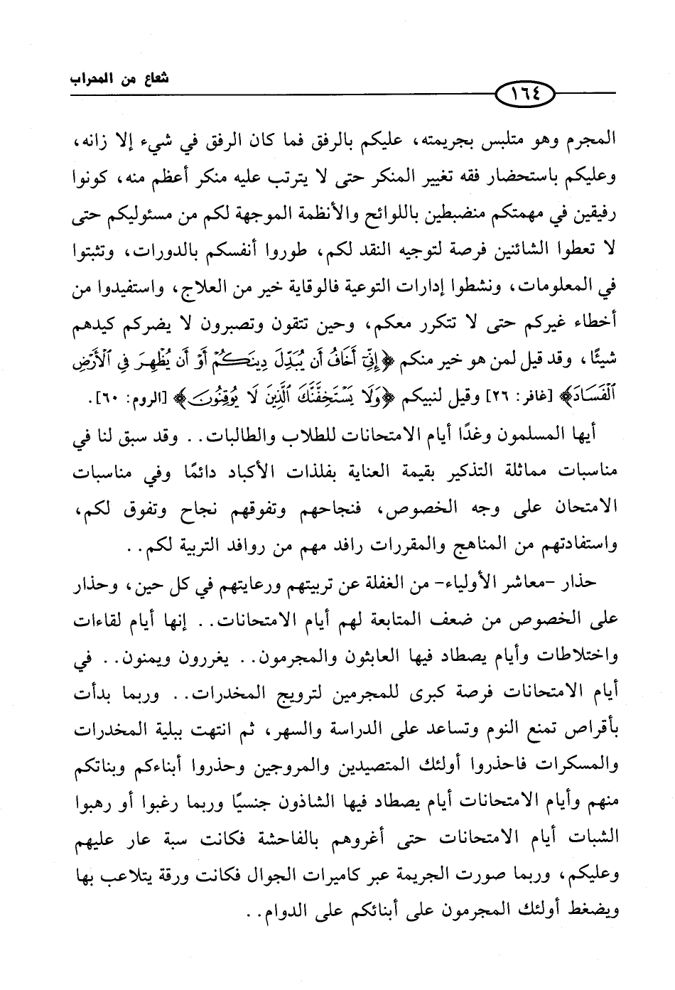 حذار- معاشر الأولياء- من الغفلة عن تربيتهم ورعايتهم في كل حين، وحذار على الخصوص من ضعف المتابعة لهم أيام الامتحانات .. إنها أيام لقاءات واختلاطات وأيام يصطاد فيها العابثون والمجرمون .. ويغررون ويمنون .. في أيام الامتحانات فرصة كبرى للمجرمين لترويج المخدرات .. وربما بدأت بأقراص تمنع النوم وتساعد على الدراسة والسهر، ثم انتهت ببلية المخدرات والمسكرات فاحذروا أولئك المتصيدين والمروجين وحذروا أبناءكم وبناتكم منهم وأيام الامتحانات أيام يصطاد فيها الشاذون جنسيًا وربما رغبوا أو رهبوا الشبات أيام الامتحانات حتى أغروهم بالفاحشة فكانت سبة عار عليهم وعليكم، وربما صورت الجريمة عبر كاميرات الجوال فكانت ورقة يتلاعب بها ويضغط أولئك المجرمون على أبنائكم على الدوام ..