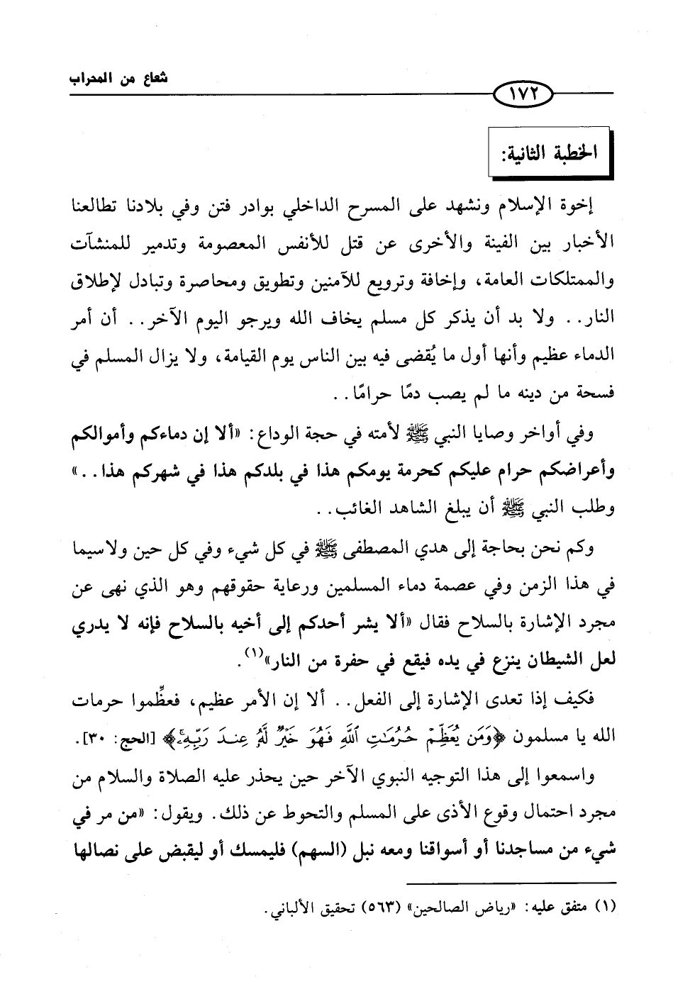 وكم نحن بحاجة إلى هدي المصطفى صلى الله عليه وسلم في كل شيء وفي كل حين ولاسيما في هذا الحدين وفي عصمة دماء المسلمين ورعاية حقوقهم وهو الذي نهى عن مجرد الإشارة بالسلاح فقال «ألا يشر أحدكم إلى أخيه بالسلاح فإنه لا يدري لعل الشيطان ينزع في يده فيقع في حفرة من النار» (¬1).