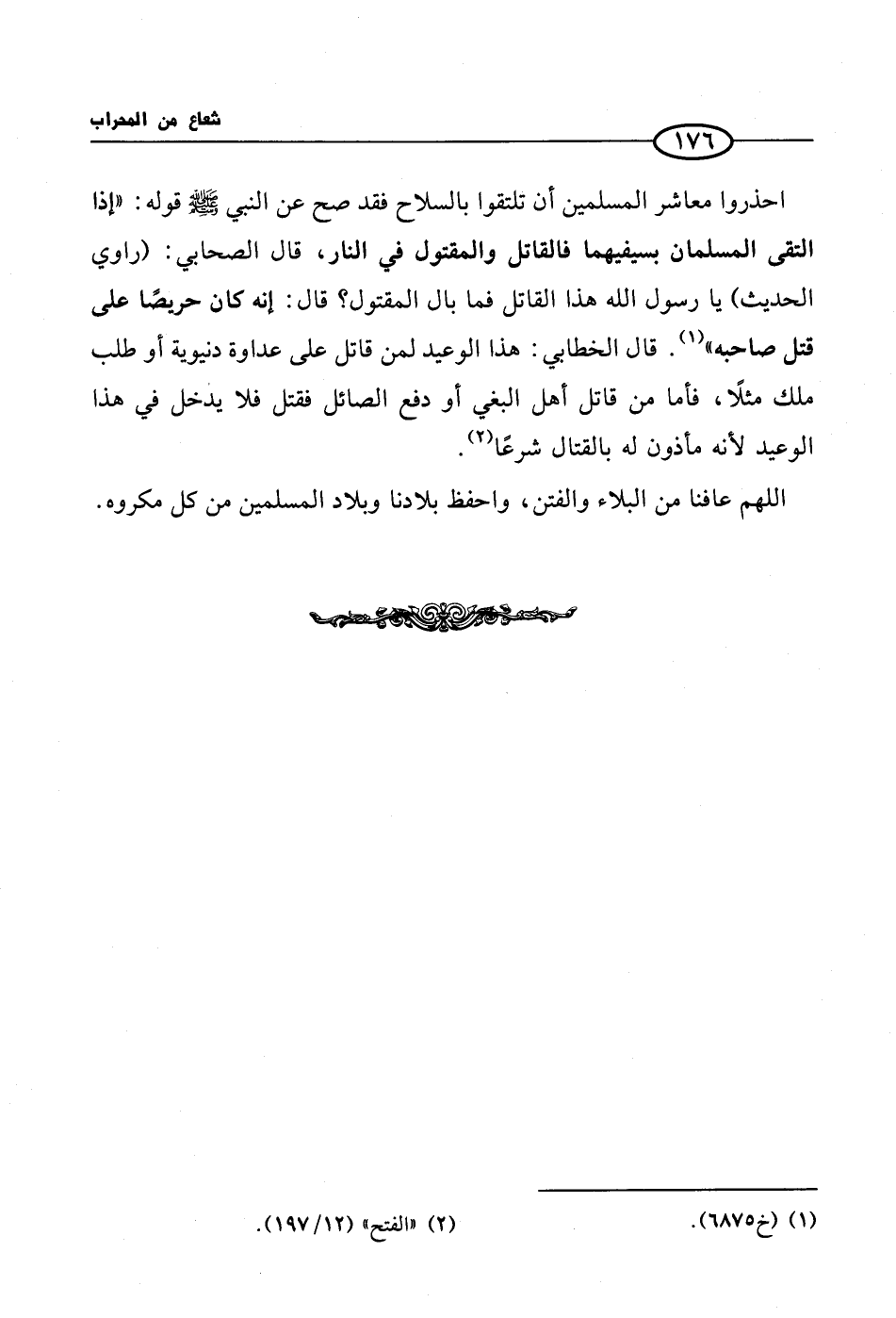 احذروا معاشر المسلمين أن تلتقوا بالسلاح فقد صح عن النبي صلى الله عليه وسلم قوله: «إذا التقى المسلمان بسيفيهما فالقاتل والمقتول في النار، قال الصحابي: (راوي الحديث) يا رسول الله هذا القاتل فما بال المقتول؟ قال: إنه كان حريصًا على قتل صاحبه» (¬1). قال الخطابي: هذا الوعيد لمن قاتل على عداوة دنيوية أو طلب ملك مثلًا، فأما من قاتل أهل البغي أو دفع الصائل فقتل فلا يدخل في هذا الوعيد لأنه مأذون له بالقتال شرعًا (¬2).